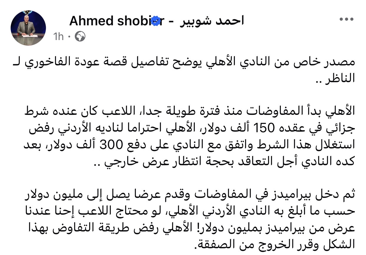 وكتب شوبير عبر حسابه الشخصي بموقع فيسبوك: “الأهلي بدأ المفاوضات منذ فترة طويلة جدا، اللاعب كان عنده شرط جزائي في عقده 150 ألف دولار، الأهلي احتراما لناديه الأردني رفض استغلال هذا الشرط واتفق مع النادي على دفع 300 ألف دولار، بعد كده النادي أجل التعاقد بحجة انتظار عرض خارجي”.