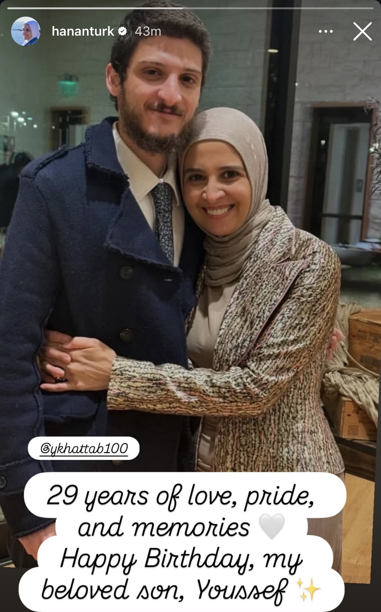 ونشرت حنان ترك صورة تجمعها بابنها عبر حسابها الخاص بموقع إنستجرام ووجهت له رسالة قائلة: “٢٩ سنة من الحب، الفخر والذكريات عيد ميلاد سعيد ابني الحبيب يوسف”.