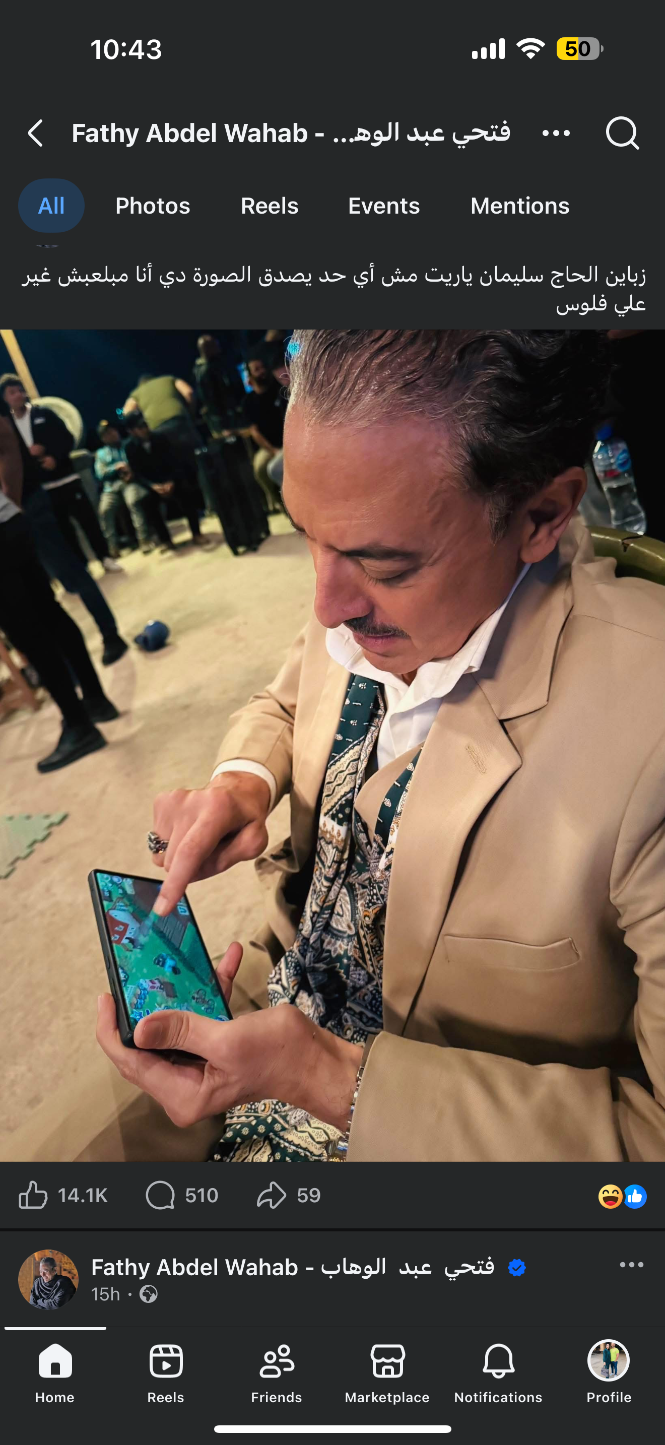 مازح الفنان فتحي عبد الوهاب جمهوره عبر مواقع التواصل الاجتماعي، بعدما نشر صورة له وهو يمسك هاتفه المحمول ويبدو كأنه يلعب إحدى الألعاب الإلكترونية، في لقطة طريفة لاقت تفاعلًا واسعًا.