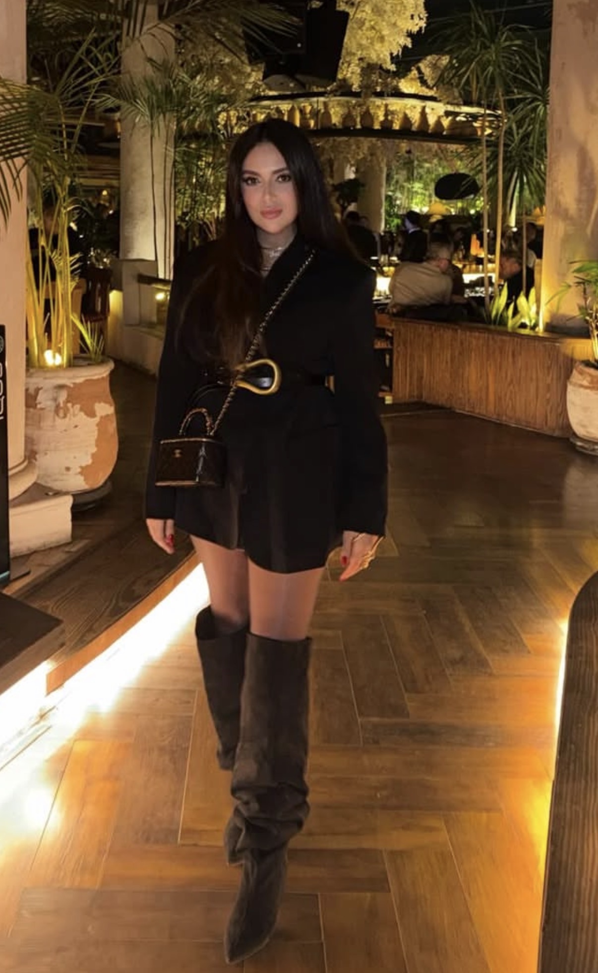 انتعلت زوجة حمدي الميرغني بوت طويل للغاية باللون الأسود، مع حقيبة يد صغيرة الحجم بنفس اللون، وتزينت ببعض الإكسسوارات البسيطة.
