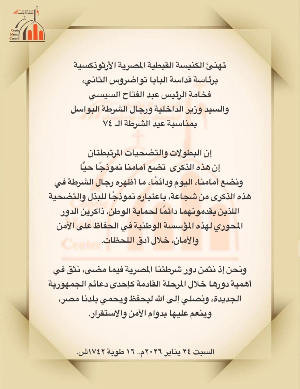 تهنئ الكنيسة القبطية المصرية الأرثوذكسية، برئاسة قداسة البابا تواضروس الثاني، فخامة الرئيس عبد الفتاح السيسي، رئيس الجمهورية، والسيد اللواء وزير الداخلية، وجميع رجال الشرطة البواسل، بمناسبة عيد الشرطة الرابع والسبعين.