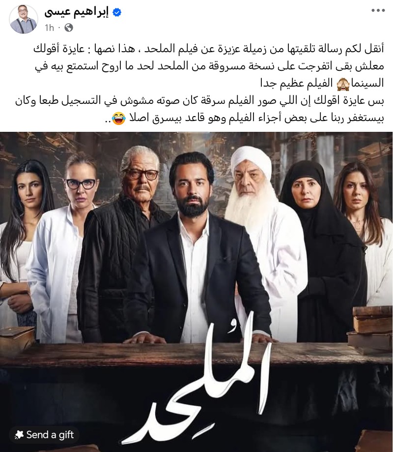 وكتب إبراهيم عيسي عبر حسابه الرسمى على موقع “فيس بوك”:"أنقل لكم رسالة تلقيتها من زميلة عزيزة عن فيلم الملحد ، هذا نصها : عايزة أقولك معلش بقى اتفرجت على نسخة مسروقة من الملحد لحد ما اروح استمتع بيه في السينما الفيلم عظيم جدا