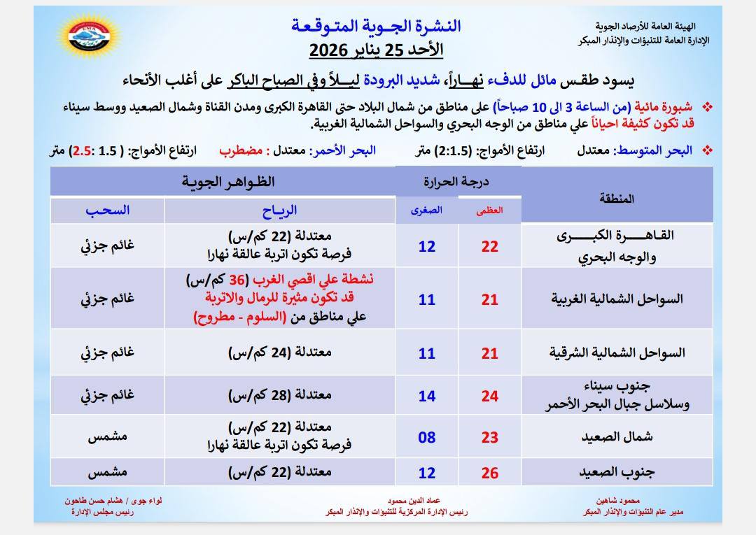 وفيما يلي بيان بدرجات الحرارة العظمى والصغرى المتوقعة غدًا الأحد على عدد من محافظات الجمهورية، بحسب ما أعلنته الهيئة العامة للأرصاد الجوية: