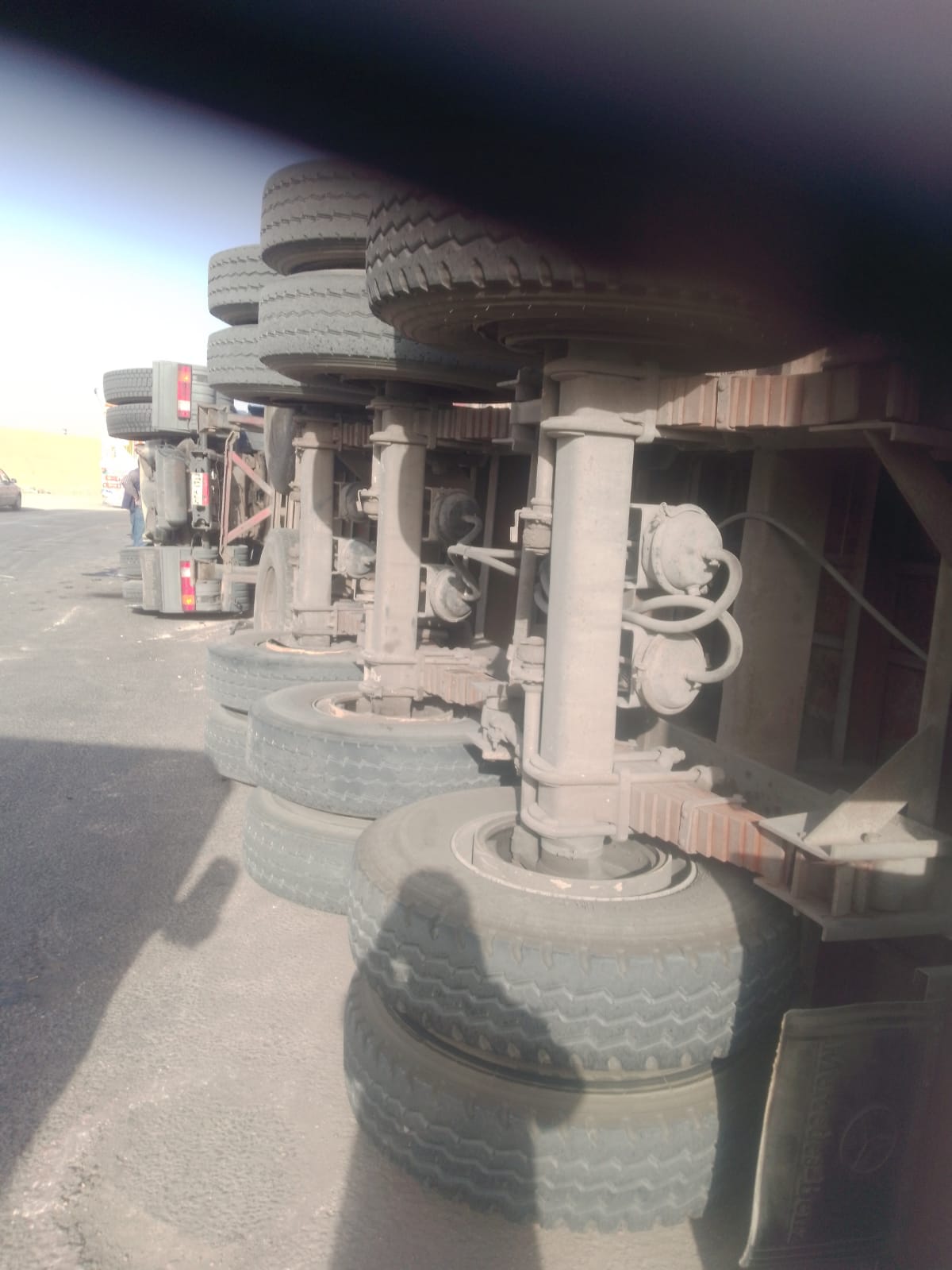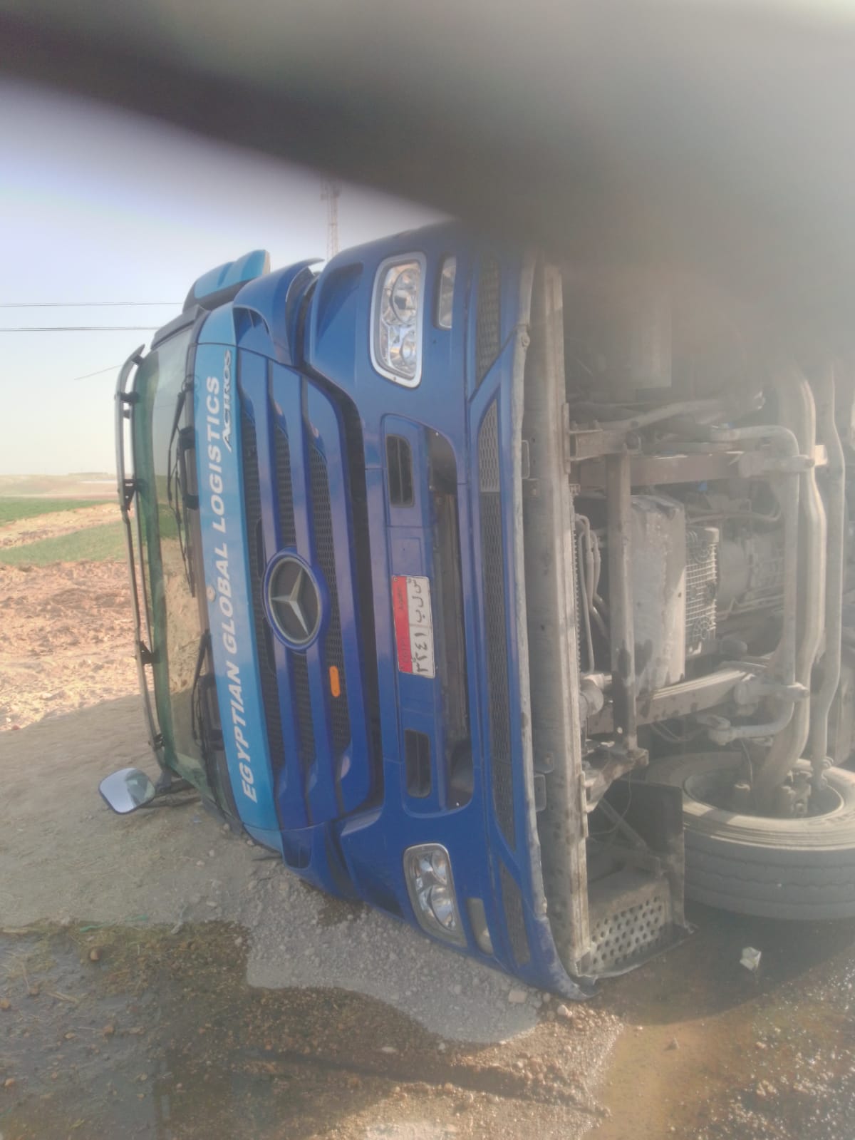 إنتقل إلى موقع الحادث ضباط المركز والإسعاف وتبين من المعاينة والفحص إنقلاب سيارة نقل " تريللا " وإصابة سائق السيارة .
