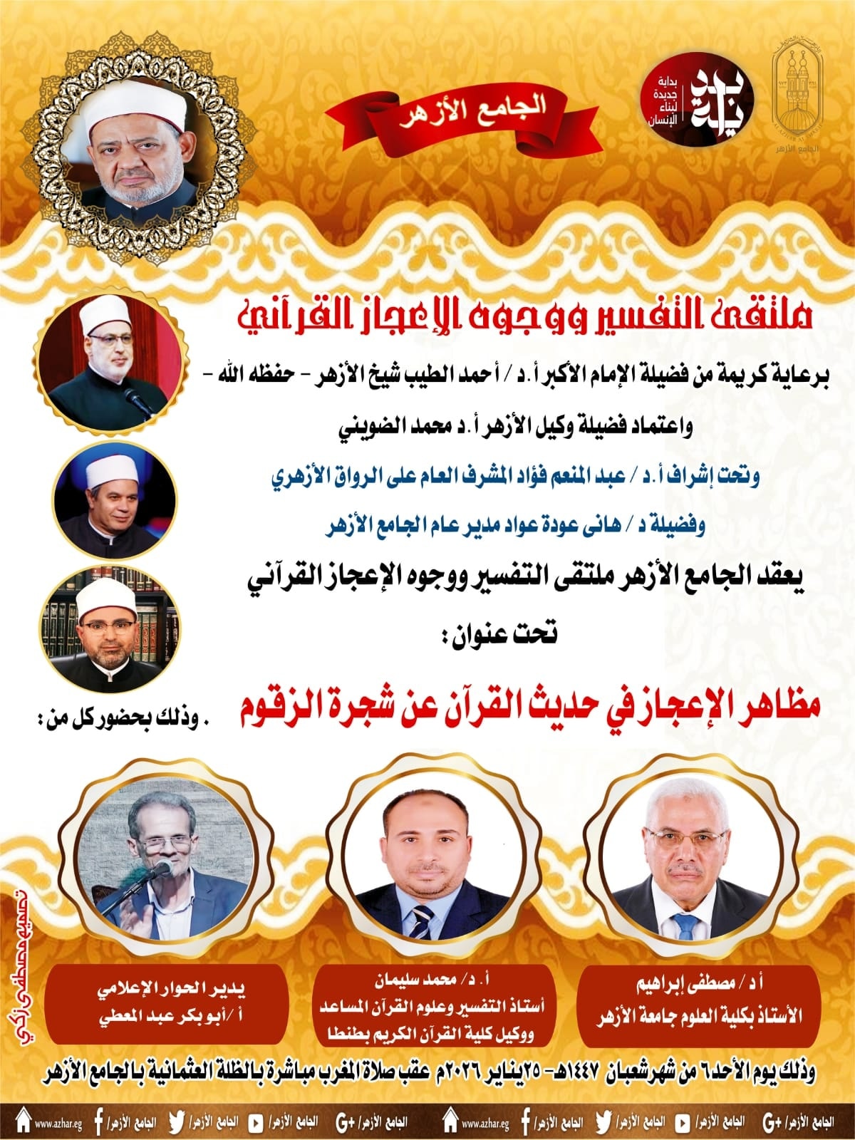يواصل ملتقى التفسير بالجامع الأزهر اليوم لقاء التفسير الأسبوعي بعنوان "وجوه الإعجاز في حديث القرآن عن شجرة الزقوم" وذلك بحضور كل من: أ.د مصطفى إبراهيم، الأستاذ بكلية العلوم بالقاهرة جامعة الأزهر، وعضو مجمع البحوث الإسلامية، وأ.د محمد سليمان، أستاذ التفسير وعلوم القرآن المساعد، ووكيل كلية القرآن الكريم بطنطا، ويدير الحوار ا/ أبو بكر عبد المعطي، الإعلامي بإذاعة القرآن الكريم.