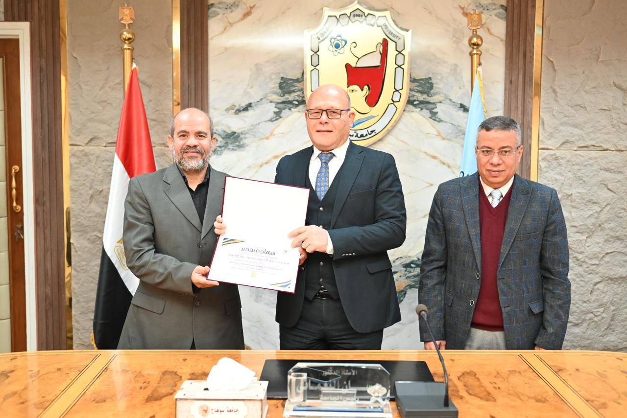 وذلك خلال مراسم رسمية أُقيمت بقاعة مجلس الجامعة بالحرم الجامعي القديم، بحضور المحاسب أشرف القاضي أمين عام الجامعة.