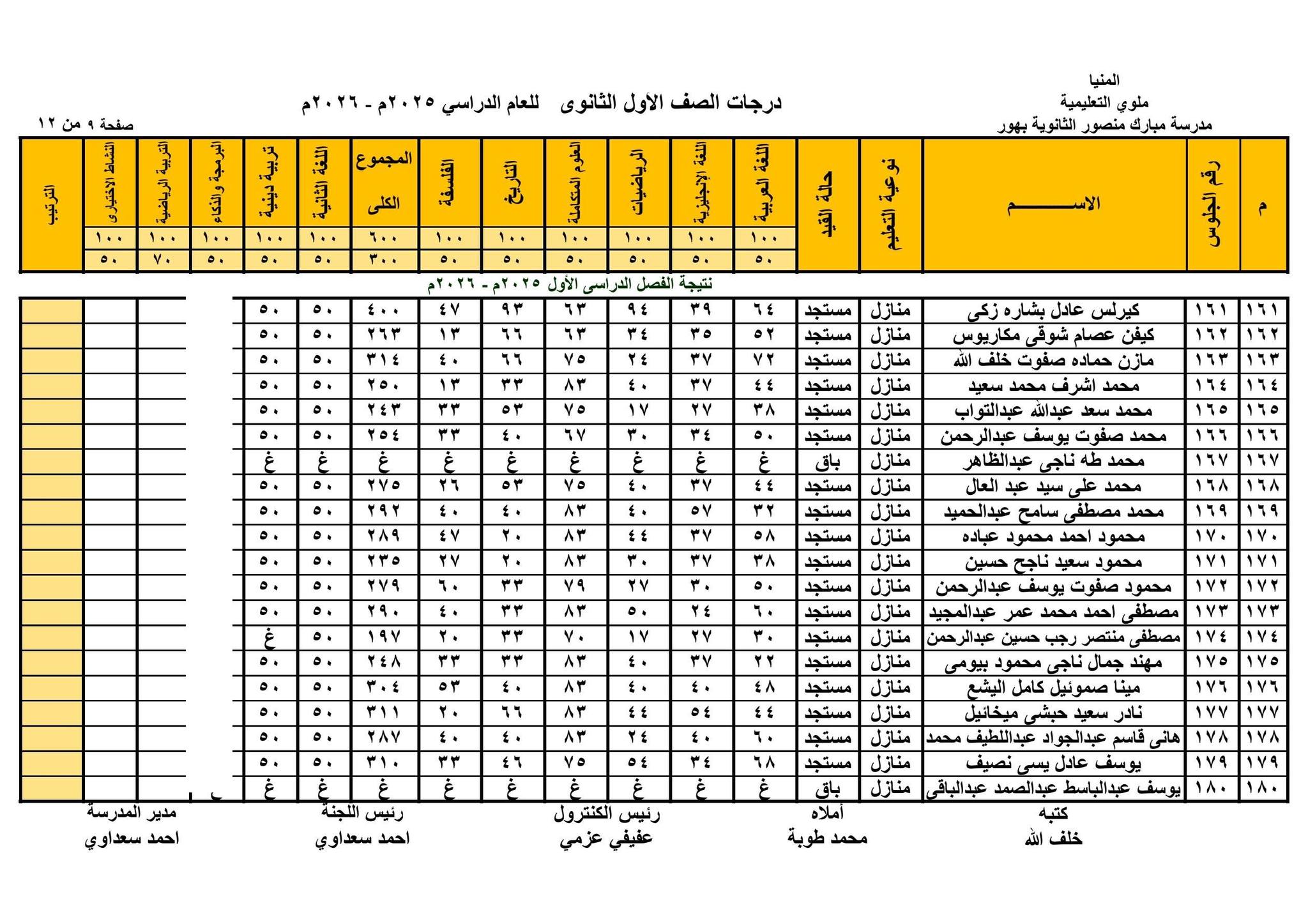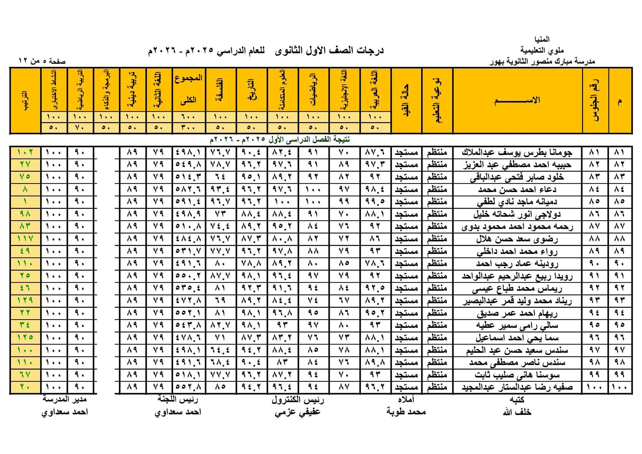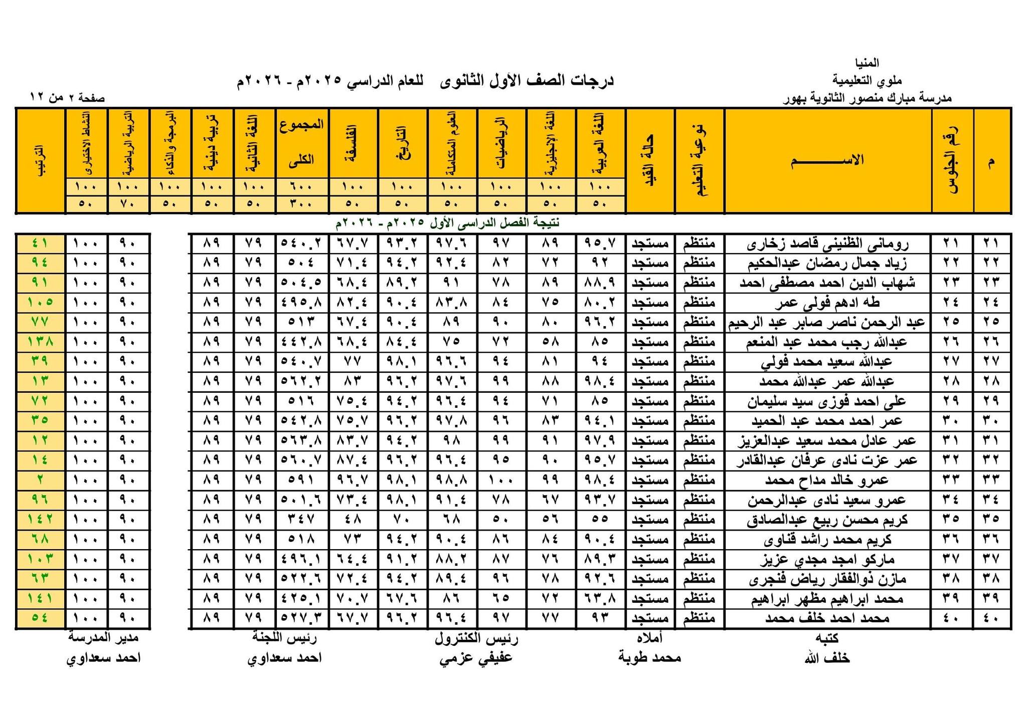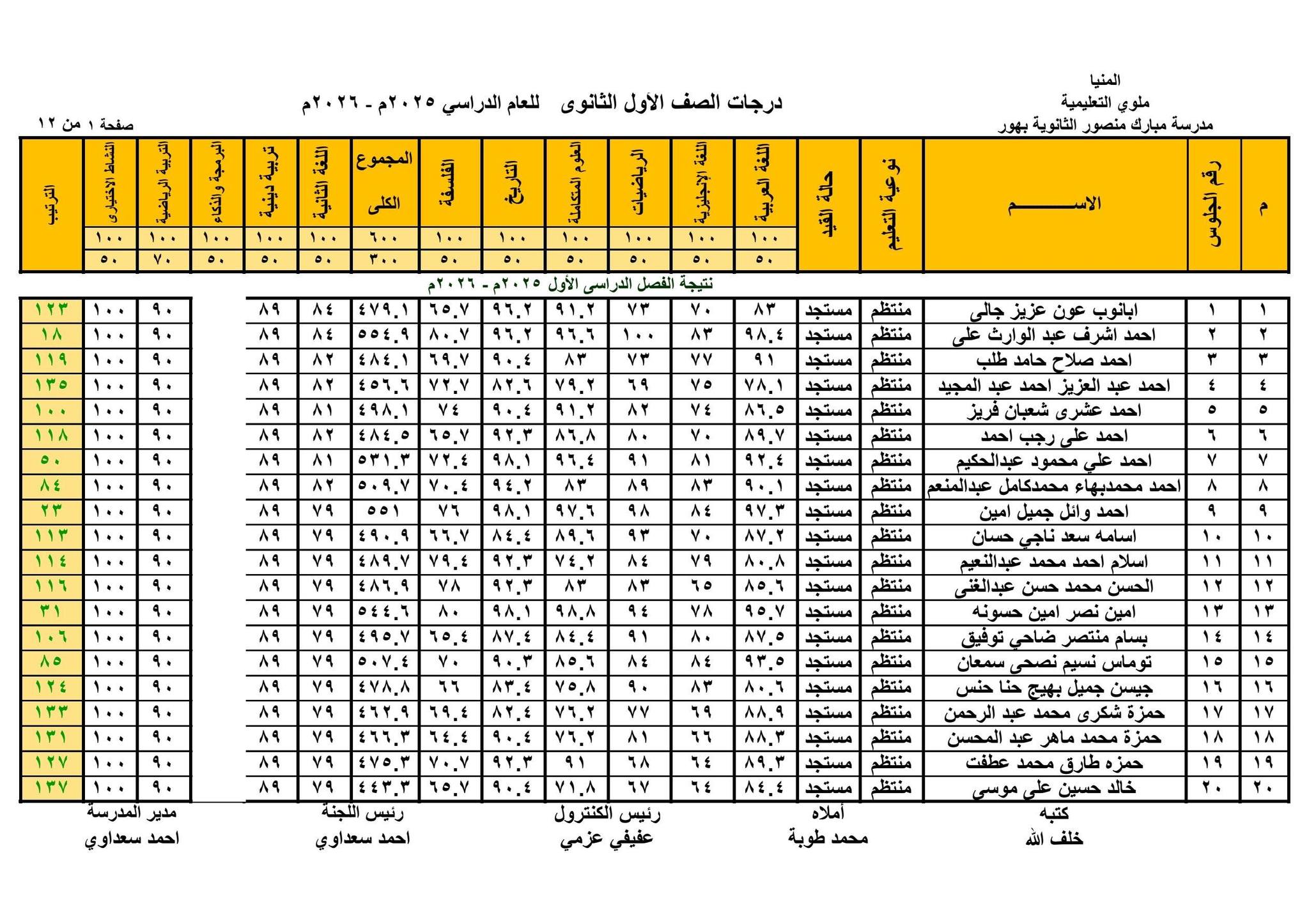 حيث قامت الصفحات الرسمية للمدارس على موقع التواصل الاجتماعي فيس بوك ، بنشر نتيجة الصف الأول الثانوي الترم الأول 2026 بالاسم ورقم الجلوس في شكل قوائم كاملة تشمل اسم الطالب ورقم جلوسه ودرجاته في مختلف المواد الأساسية و المواد غير الأساسية والمجموع الكلي