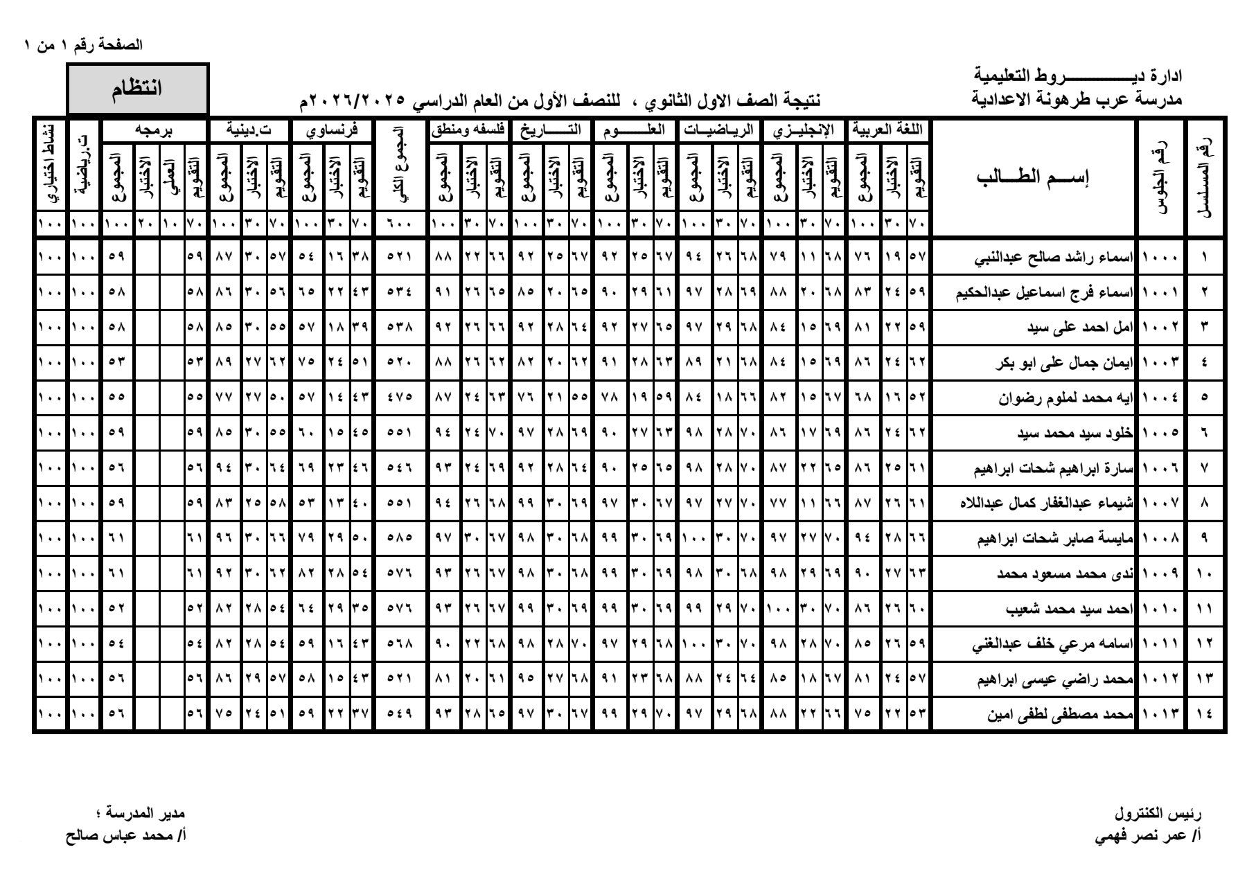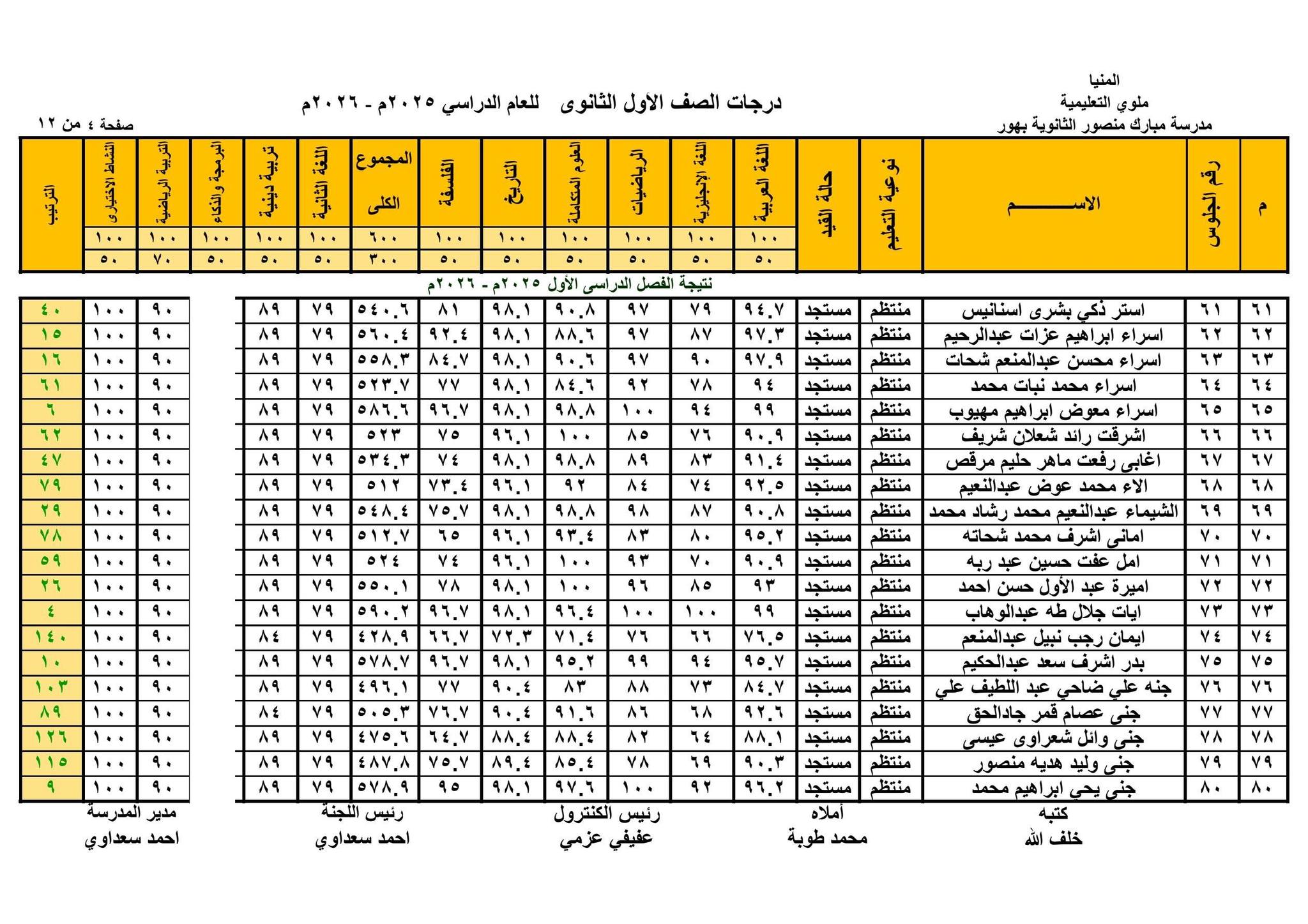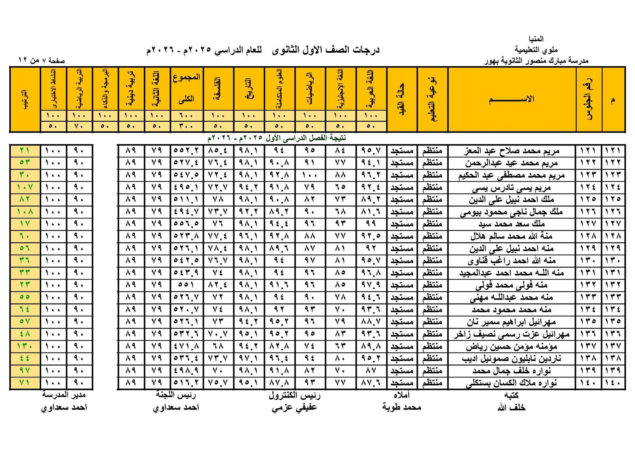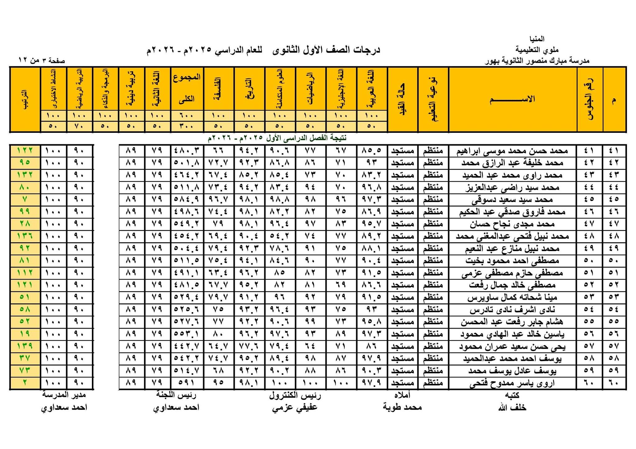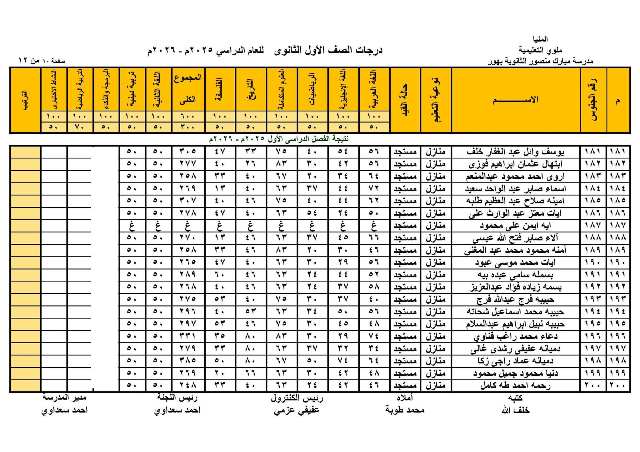 حيث قامت الصفحات الرسمية للمدارس على موقع التواصل الاجتماعي فيس بوك ، بنشر نتيجة الصف الأول الثانوي الترم الأول 2026 بالاسم ورقم الجلوس في شكل قوائم كاملة تشمل اسم الطالب ورقم جلوسه ودرجاته في مختلف المواد الأساسية و المواد غير الأساسية والمجموع الكلي