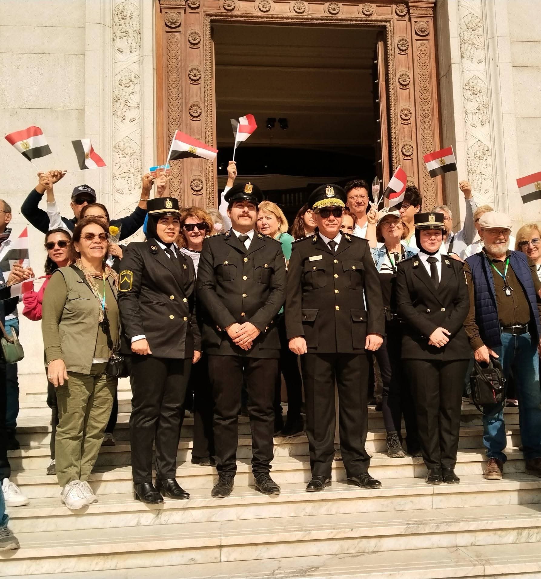 وشهدت الاحتفالية توزيع الورود وأعلام مصر على الزوار من المصريين والسائحين الأجانب، الذين شاركوا رجال الشرطة أجواء الفخر والاعتزاز بهذه المناسبة الوطنية المجيدة.