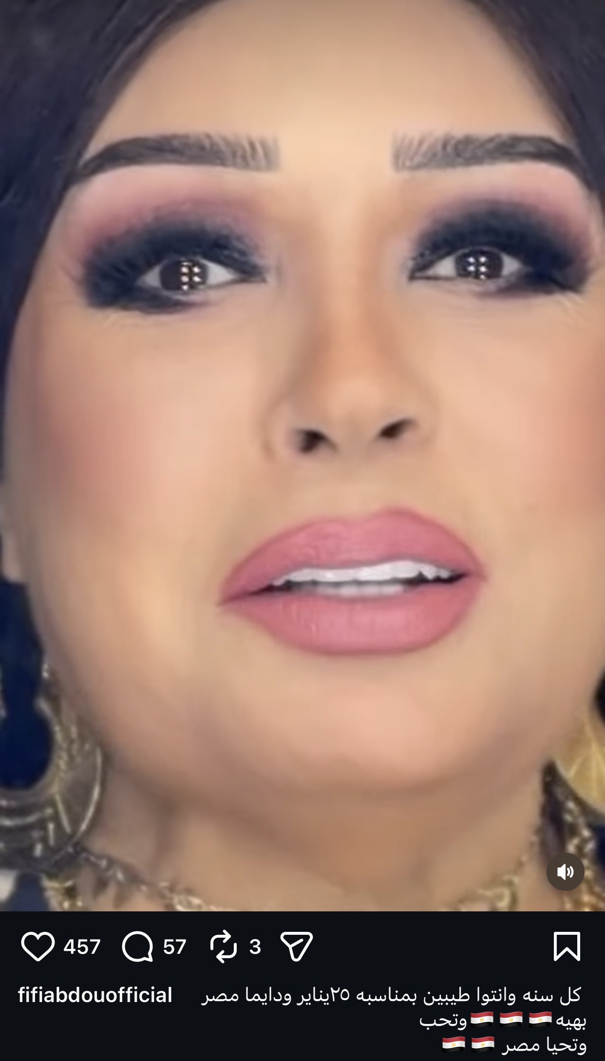 وقالت فيفي عبده: “كل سنة ومصر كلها طيبة النهاردة ٢٥ يناير كل سنة ومصر العظيمة طيبة وسيادة الرئيس والجيش المصري والشرطة والقضاء وكل رجل وامرأة مصريين وكل شاب وشابة مصريين وكل طفل وطفلة مصريين كل سنة وانتوا طيبين وبلدكوا جميلة، حلوة، بهية تتحط على الرأس وكل ٢٥ يناير واحنا طيبين”.