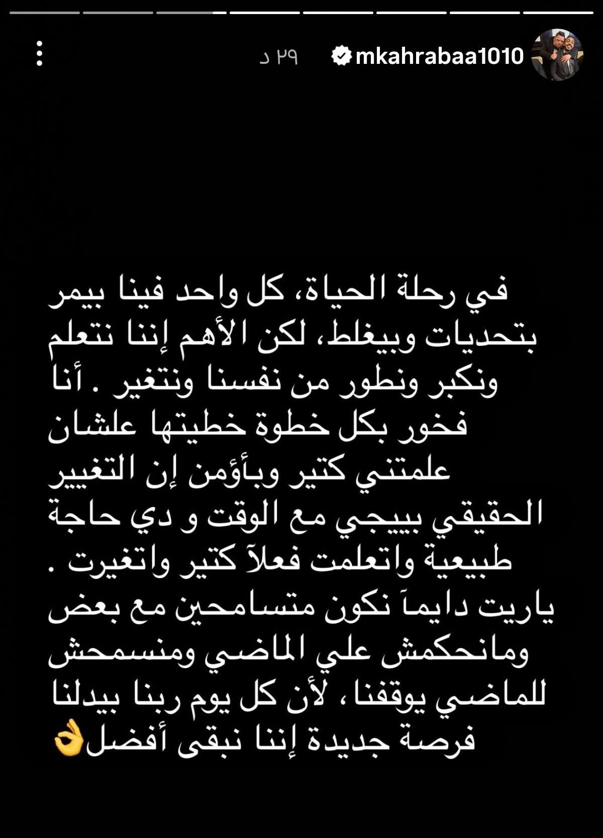 وكتب كهربا: “في رحلة الحياة، كل واحد فينا بيمر بتحديات وبيغلط، لكن الأهم إننا نتعلم ونكبر ونطور من نفسنا ونتغير أنافخور بكل خطوة خطيتها علشان علمتني كتير وبأؤمن إن التغييرالحقيقي بييجي مع الوقت ودي حاجة طبيعية واتعلمت فعلاً كتير واتغيرت” .