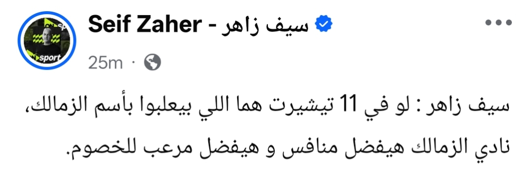 وكتب سيف زاهر: لو في 11 تيشيرت هما اللي بيعلبوا باسم الزمالك، نادي الزمالك هيفضل منافس وهيفضل مرعب للخصوم.