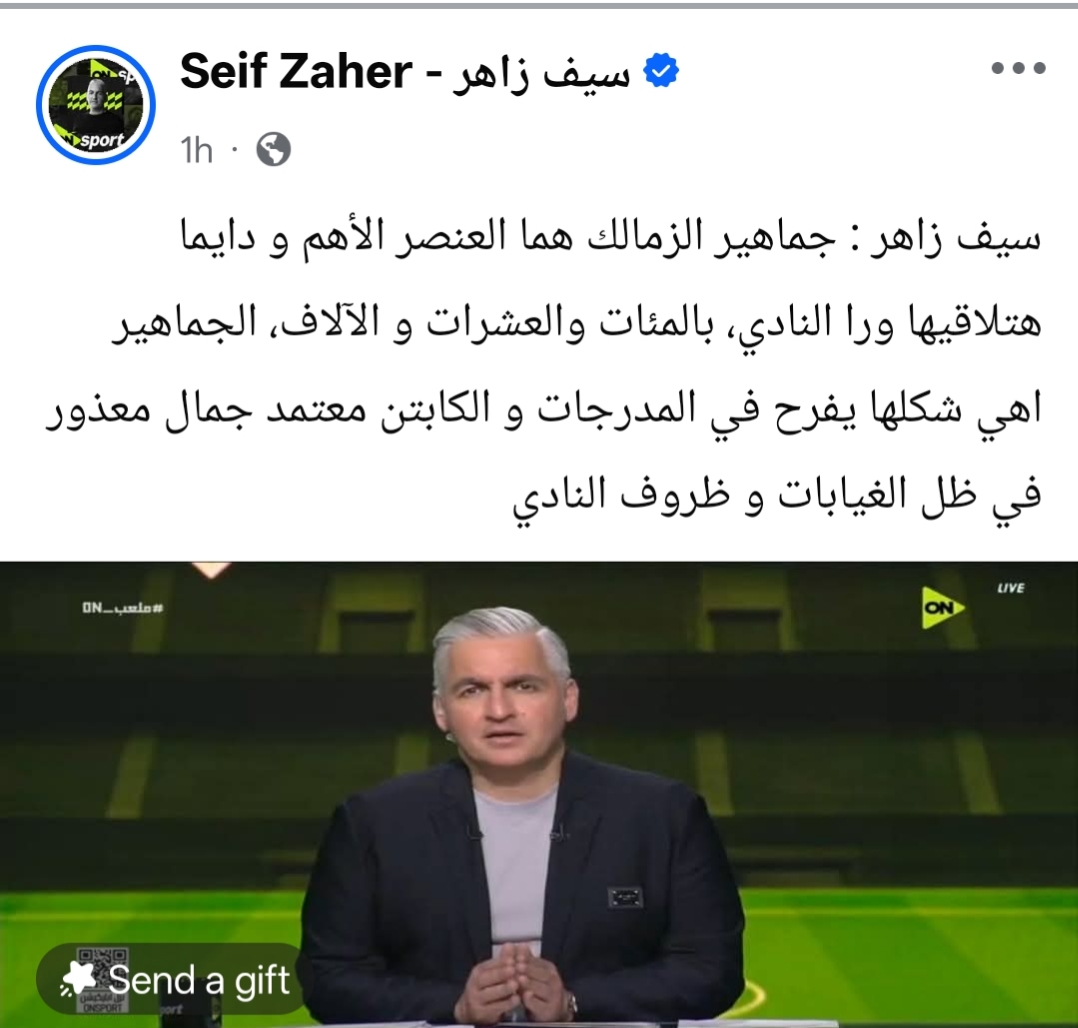 وكتب سيف زاهر، عبر حسابه الشخصي بموقع التواصل الاجتماعي فيسبوك: جماهير الزمالك هم العنصر الأهم ودايما هتلاقيها ورا النادي، بالمئات والعشرات والآلاف، الجماهير شكلها يفرح في المدرجات والكابتن معتمد جمال معذور في ظل الغيابات وظروف النادي".