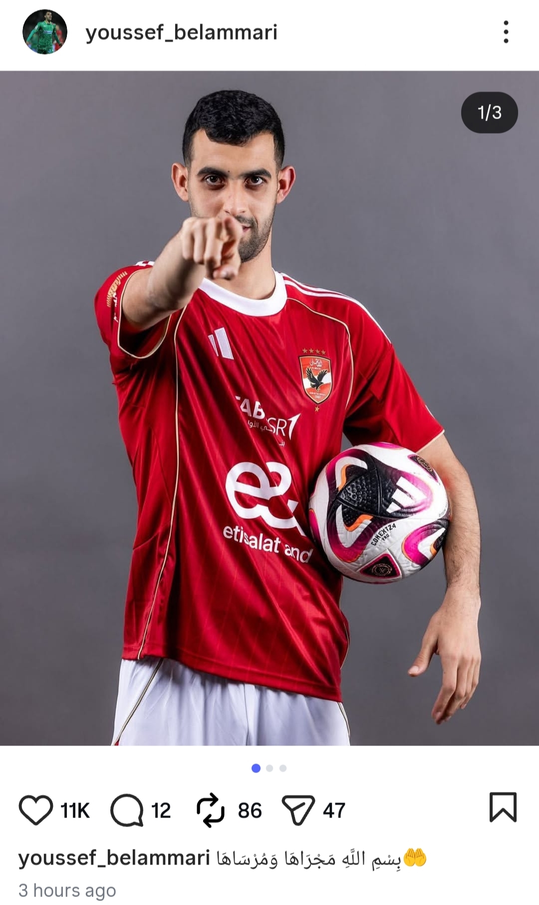 شارك يوسف بلعمري المنضم حديثا إلى النادي الأهلي، جمهوره منشورا بعد انضمامه إلى المارد الأحمر، خلال فترة الانتقالات الشتوية الجارية، قادما من الرجاء المغربي.