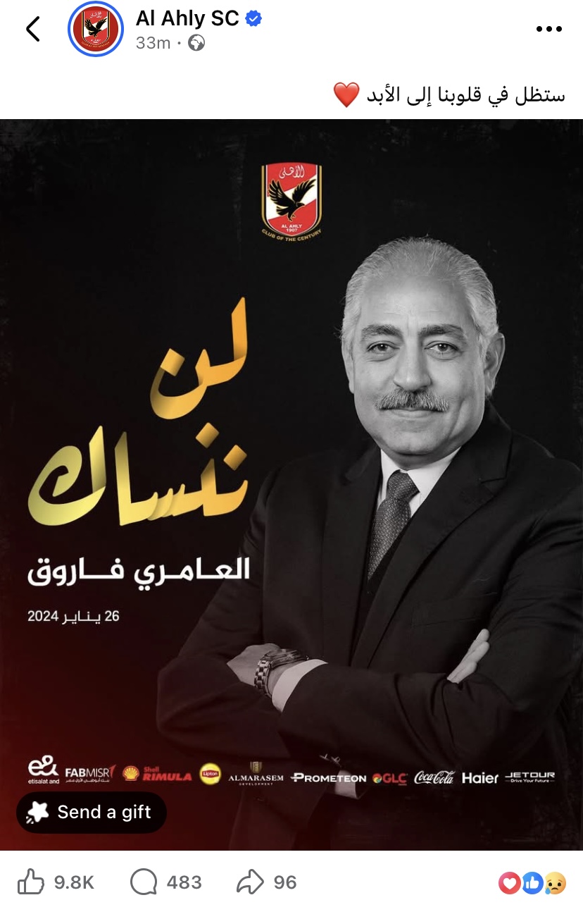 وشاركت صفحة الأهلي صورة الراحل العامري فاروق وعلقت : "لن ننساك ستظل في قلوبنا إلي الأبد".