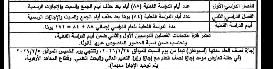 وشددت وزارة التربية والتعليم والتعليم الفني ، في الخريطة الزمنية الخاصة بالعام الدراسي الحالي 2025 / 2026 على أن إجمالي عدد أيام الدراسة في الترم الثاني 2026 في المدارس من المقرر أن يكون 84 يوماً بعد حذف أيام الجمع والسبت والإجازات الرسمية