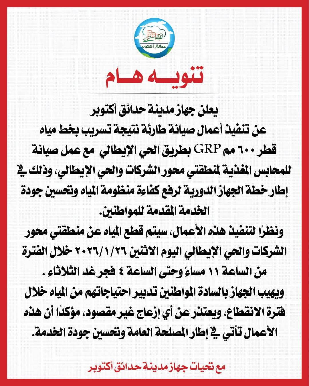 ويهيب جهاز مدينة حدائق أكتوبر المواطنين ضرورة تدبير احتياجاتهم من المياه خلال فترة الانقطاع، مقدمة اعتذارها عن أي إزعاج غير مقصود.