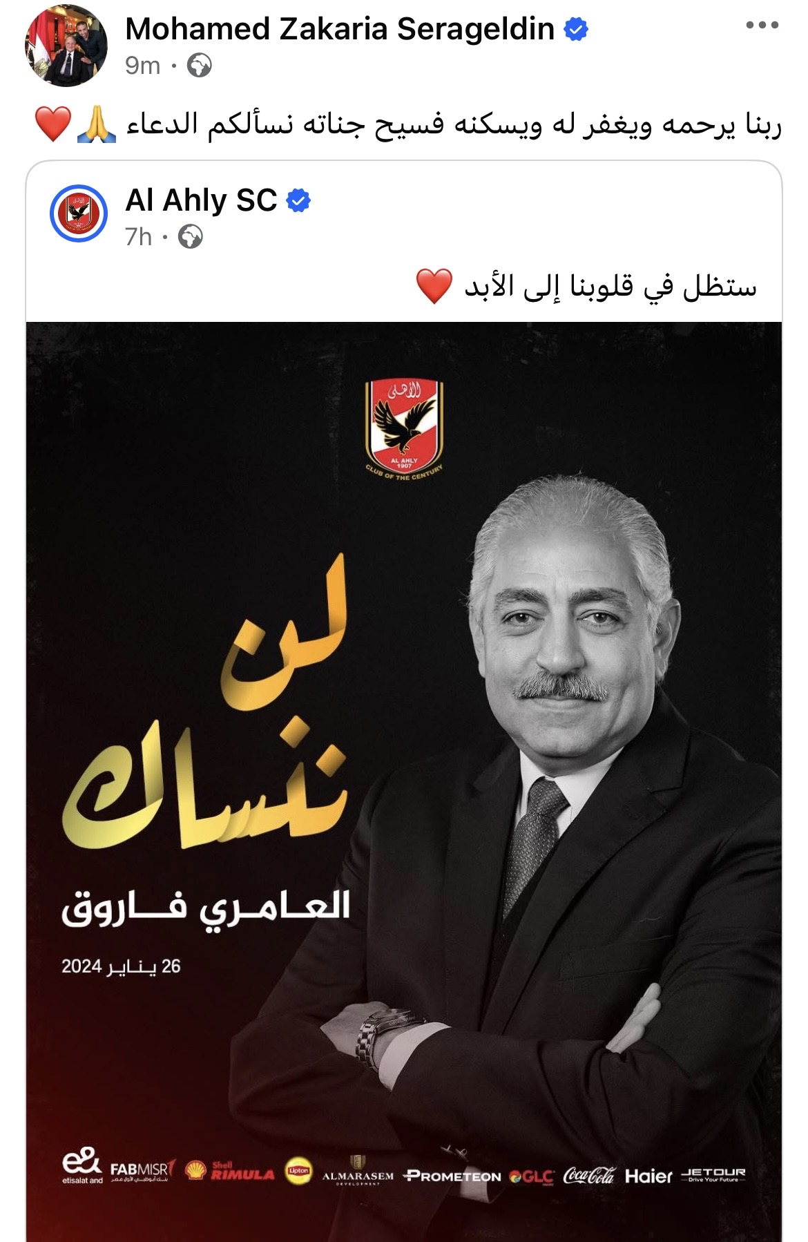 أحيا محمد سراج الدين، عضو مجلس إدارة النادي الأهلي سابقا، ذكرى رحيل العامري فاروق نائب رئيس القلعة الحمراء الأسبق.
