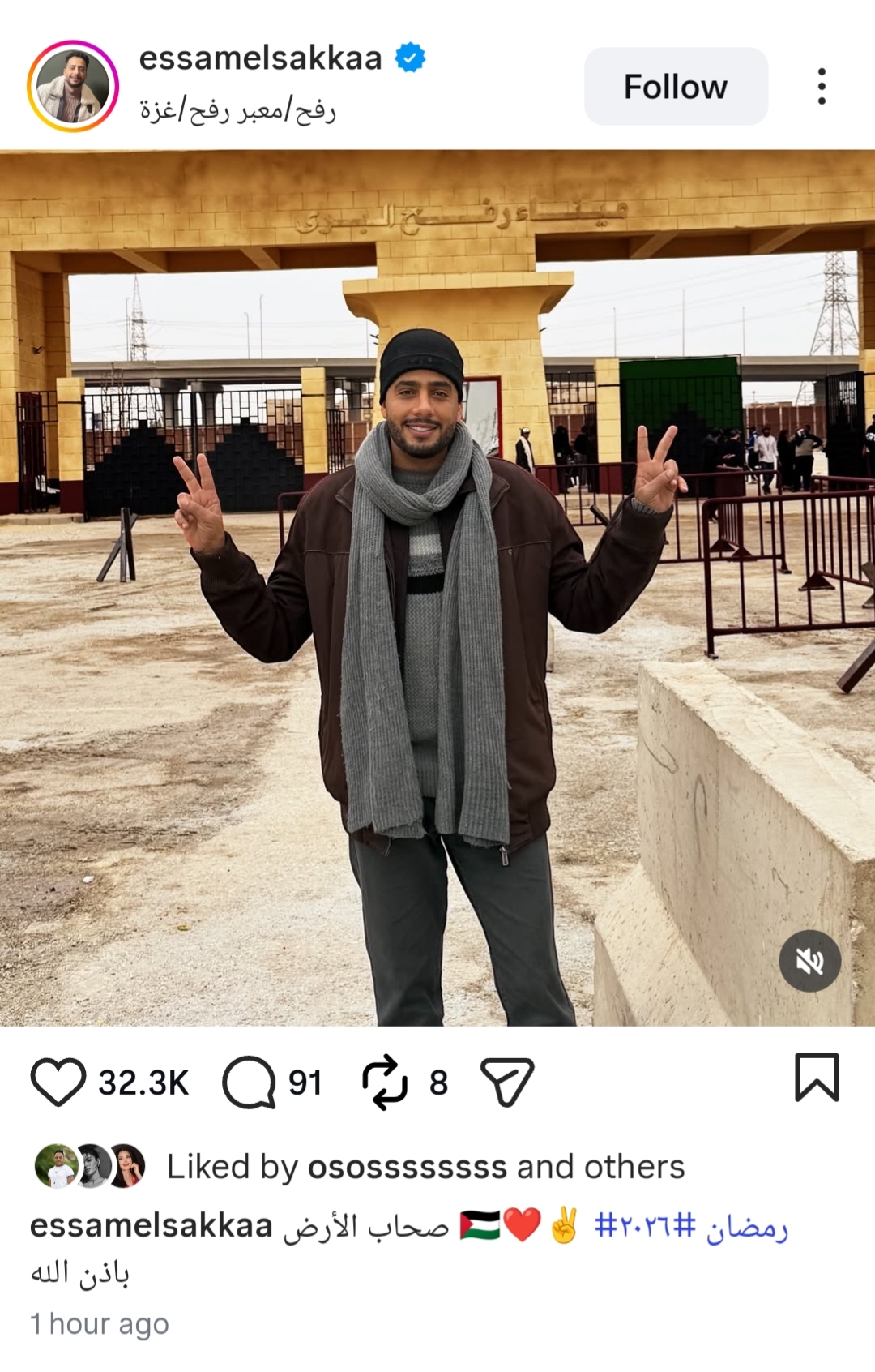 و نشر عصام السقا صورة من أمام معبر رفح و علق كاتبا:صحاب الارض بأذن الله رمضان 2026.