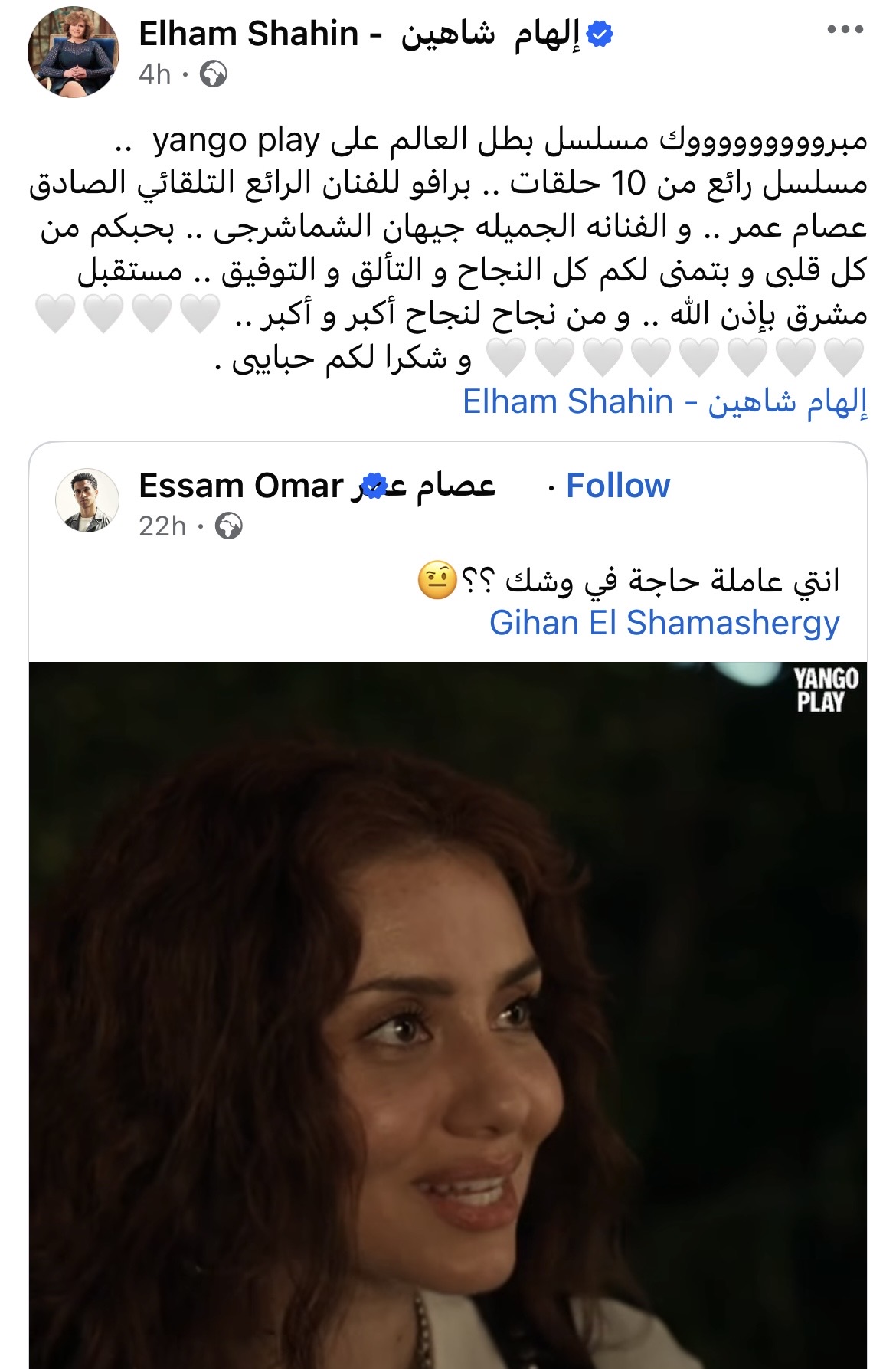 وكتبت إلهام شاهين عبر حسابها على فيسبوك: "مبروك مسلسل بطل العالم على yango play .. مسلسل رائع من 10 حلقات برافو للفنان الرائع التلقائي الصادق عصام عمر، والفنانة الجميلة جيهان الشماشرجى بحبكم من كل قلبى وبتمنى لكم كل النجاح والتألق والتوفيق مستقبل مشرق بإذن الله ومن نجاح لنجاح أكبر وأكبر".