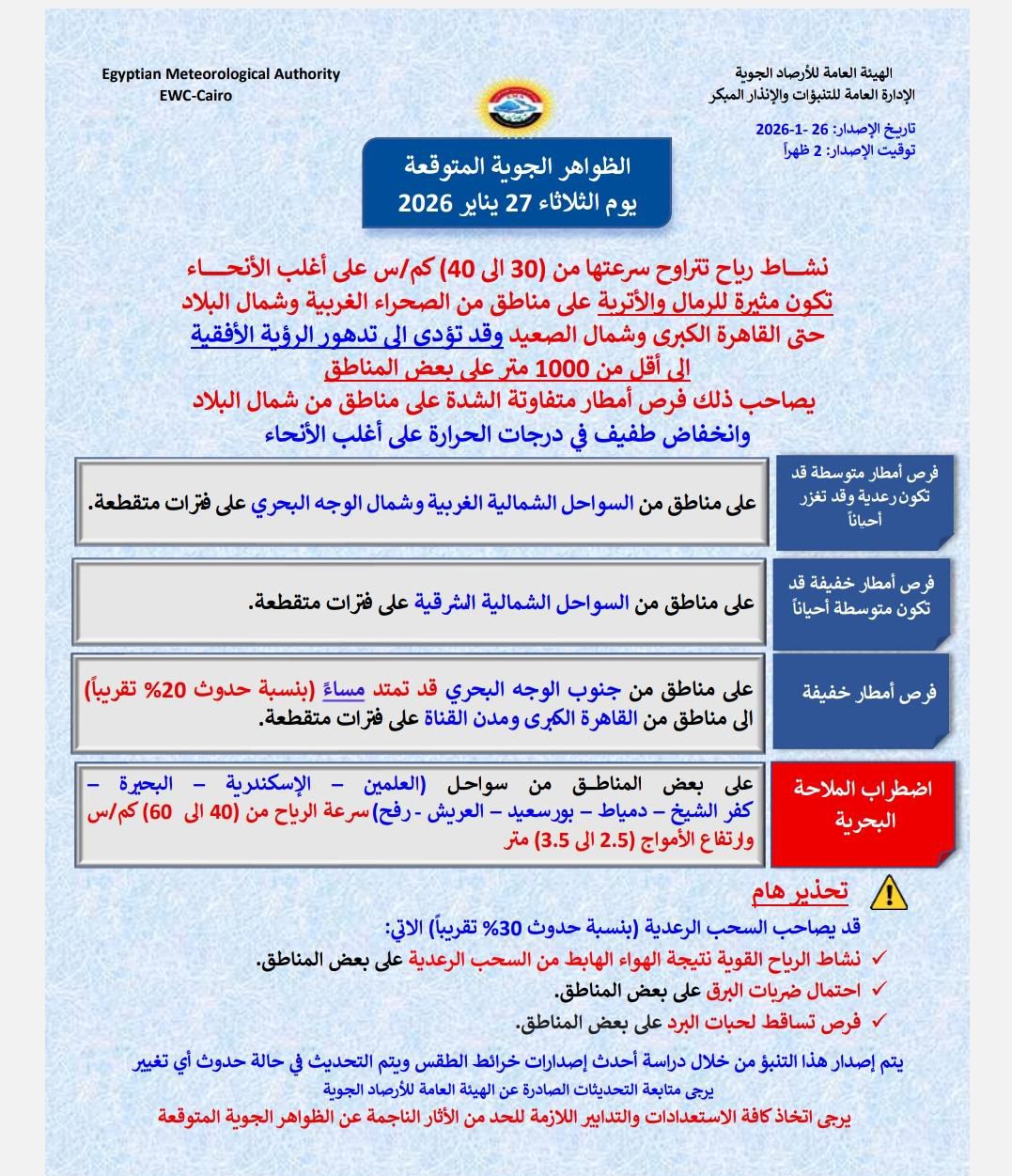 وأوضحت هيئة الأرصاد الجوية، أن يشهد طقس غداً الثلاثاء نشاط رياح تتراوح سرعتها من 30 إلى 40 كم/س على أغل بالأنحاء، تكون مثيرة للرمال والآتربة على مناطق من الصحراء الغربية وشمال البلاد حتى القاهرة الكبرى وشمال الصعيد،وقد تؤدي إلى تدهور الرؤية الأفقية إلى أقل من 1000 متر على بعض المناطق.
