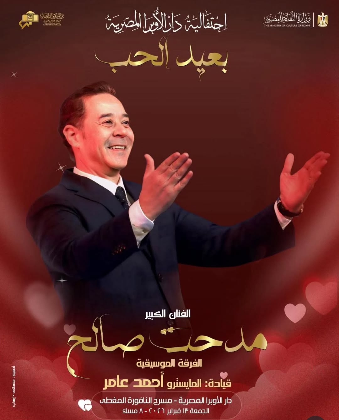 ويأتي حفل مدحت صالح، في عيد الحب بمصاحبة الفرقة الموسيقية بقيادة المايسترو أحمد عامر.