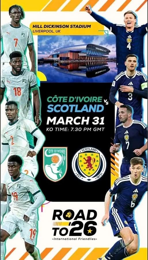 أعلن الاتحاد الإيفواري لكرة القدم عن خوض منتخب بلاده مباراة ودية دولية أمام منتخب اسكتلندا، ضمن استعدادات الفريقين للمشاركة في نهائيات كأس العالم 2026.