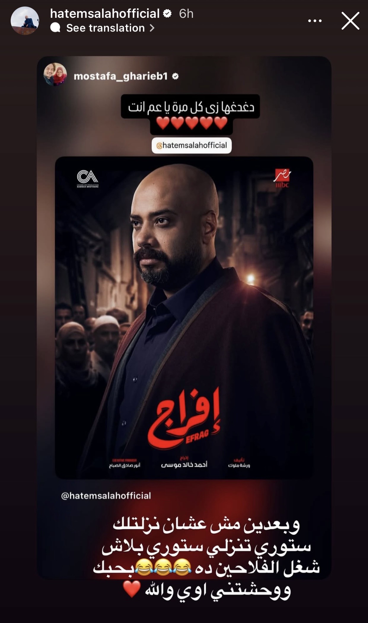 حرص الفنان مصطفى غريب على دعم زميله الفنان حاتم صلاح، وذلك من خلال ستوري عبر حسابه على إنستجرام، نشر خلالها بوستر مسلسل حاتم صلاح الجديد «إفراج» المقرر عرضه في موسم رمضان 2026.