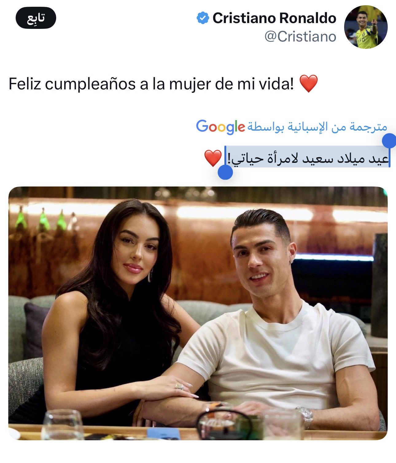 ونشر كريستيانو صور تجمعه مع جورجينا عبر حسابه الشخصي اكس وعلق قايلة :" عيد ميلاد سعيد لامرأة حياتي! ".