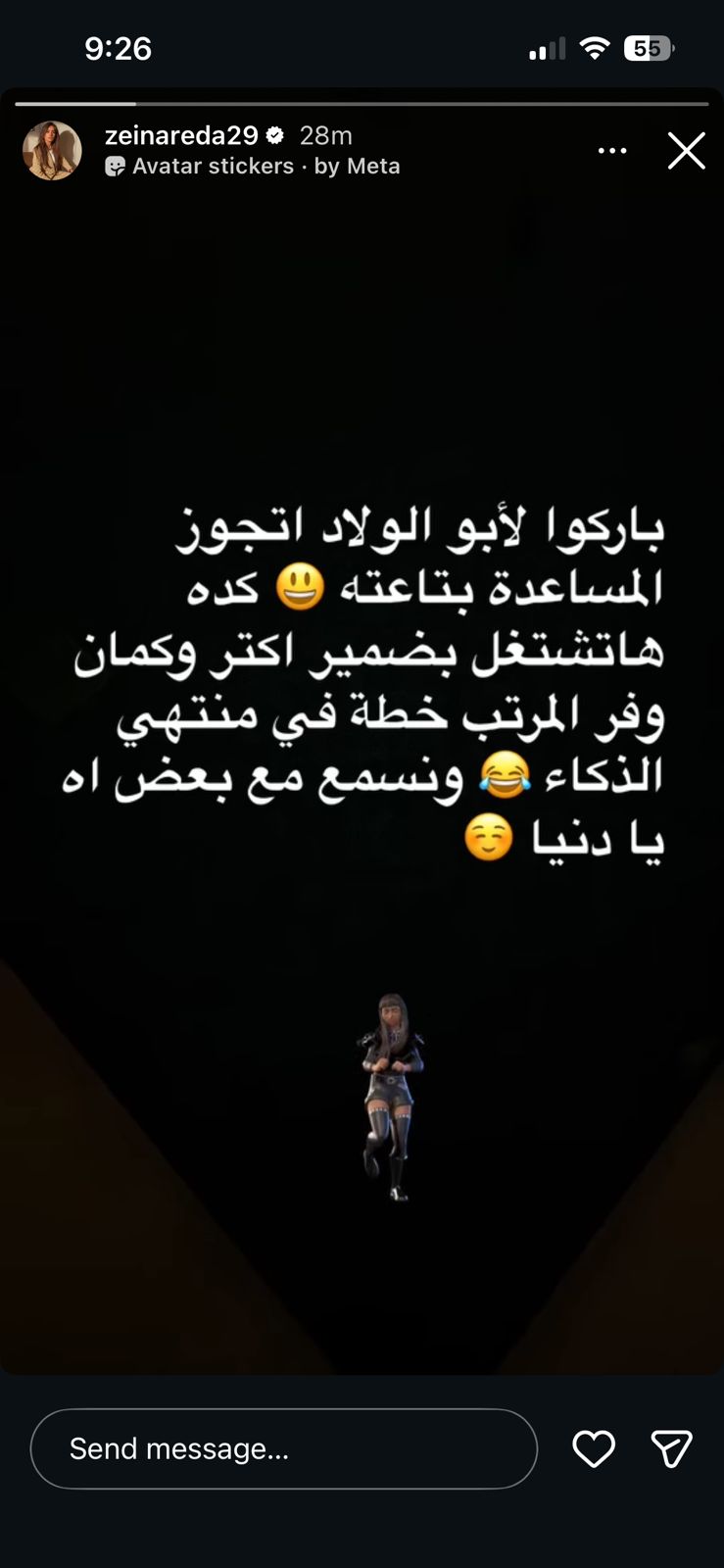 وكتبت زينه عبر صفحتها علي موقع التواصل الاجتماعي “إنستجرام”:"باركو لأبو الولاد اتجوز المساعدة بتاعته كده واشتغل بضمير اكتر واكتر وكمان وفر المرتب خطة في منتهي الذكاء ونسمع مع بعض اه يا دنيا".