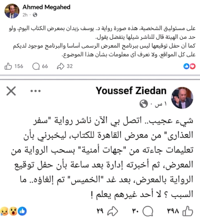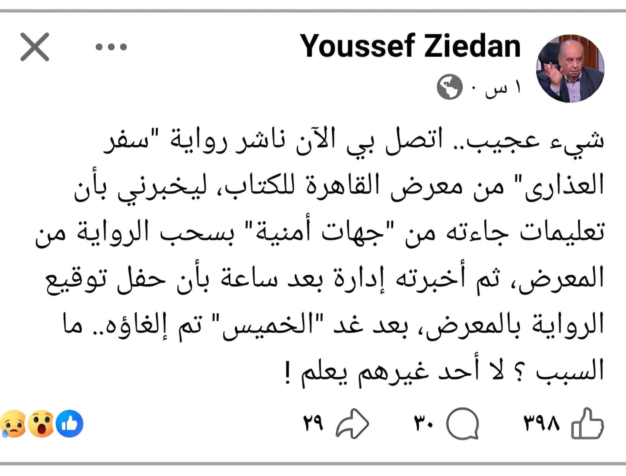 وكتب زيدان : "شيء عجيب.. اتصل بي الآن ناشر رواية "سفر العذارى" من معرض القاهرة للكتاب، ليخبرني بأن تعليمات جاءته من "جهات أمنية" بسحب الرواية من المعرض، ثم أخبرته إدارة بعد ساعة بأن حفل توقيع الرواية بالمعرض، بعد غد "الخميس" تم إلغاؤه.. ما السبب؟ لا أحد غيرهم يعلم!".