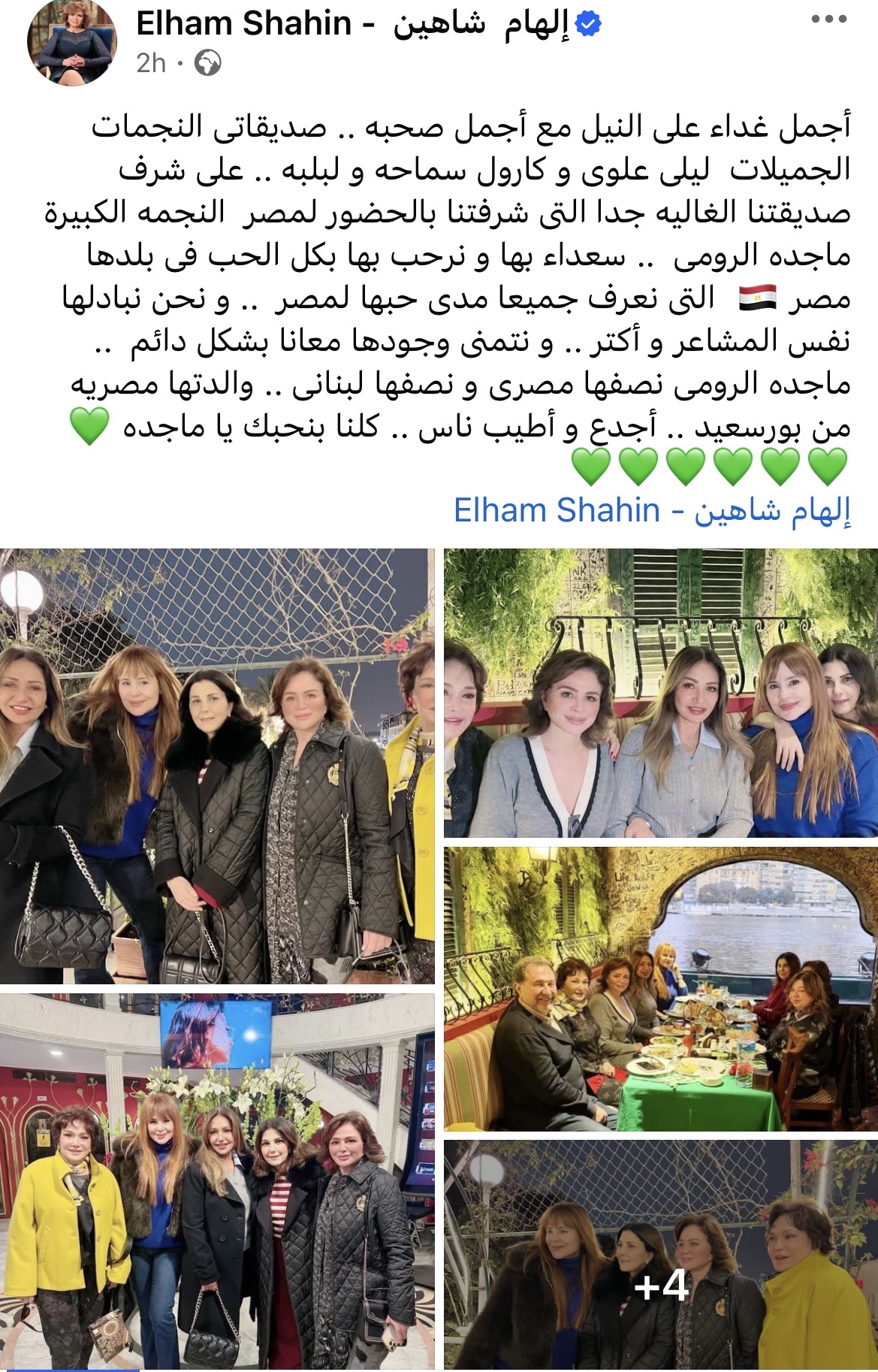 وكتبت إلهام شاهين عبر حسابها على فيسبوك: “أجمل غداء على النيل مع أجمل صحبه .. صديقاتى النجمات الجميلات ليلى علوى وكارول سماحه ولبلبه .. على شرف صديقتنا الغالية جدًا التى شرفتنا بالحضور لمصر النجمة الكبيرة ماجده الرومى.. سعداء بها و نرحب بها بكل الحب فى بلدها مصر، التى نعرف جميعًا مدى حبها لمصر .. ونحن نبادلها نفس المشاعر وأكتر .. ونتمنى وجودها معانا بشكل دائم .. ماجدة الرومى نصفها مصرى ونصفها لبنانى.. والدتها مصرية من بورسعيد .. أجدع وأطيب ناس كلنا بنحبك يا ماجدة".