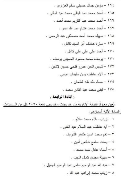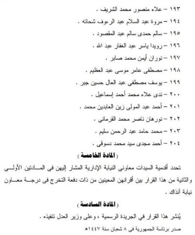 نص القرار على تعيين المقبولين من خريجي كليات الحقوق والشريعة والقانون والشرطة من الدفعتين المشار إليهما، بعد استيفائهم الاشتراطات القانونية واجتيازهم الإجراءات المقررة، وجاء أسماء المعينين كالتالي: