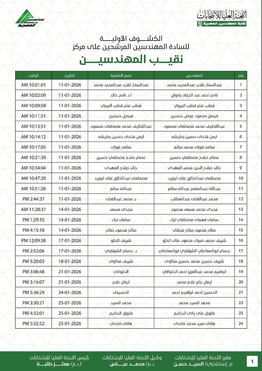 وذكرت اللجنة، في بيان رسمي، أن الكشوف الأولية ضمّت 24 مرشحًا على مقعد نقيب عام المهندسين، وذلك عقب انسحاب المهندس أحمد عثمان من السباق الانتخابي، مشيرة إلى أن جميع الأسماء الواردة استوفت الشروط المقررة مبدئيًا لتقديم أوراق الترشح.