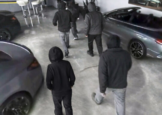 أظهرت تسجيلات كاميرات المراقبة أن هناك 8 لصوص مقنعين حطموا الواجهة الزجاجية للمعرض واقتحموا وكالة Lockwood Leasing عند الساعة 3:35 فجرًا يوم 11 يناير من عام 2026 .