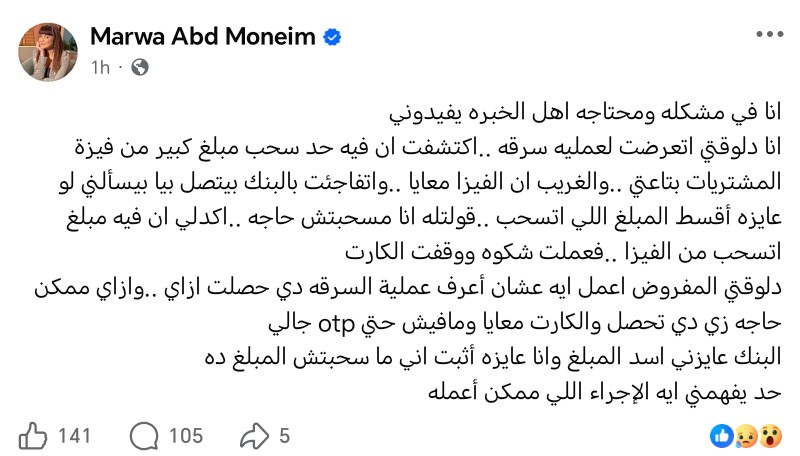 وكتبت مروة عبد المنعم عبر صفحتها علي موقع التواصل الاجتماعي فيسبوك:" أنا في مشكلة ومحتاجة أهل الخبرة يفيدوني.. أنا دلوقتي اتعرضت لعمليه سرقة.. اكتشفت إن فيه حد سحب مبلغ كبير من فيزا المشتريات بتاعتي.. والغريب إن الفيزا معايا.. واتفاجئت بالبنك بيتصل بيا بيسألني لو عايزة أقسط المبلغ اللي اتسحب.. قلتله أنا ماسحبتش حاجة.. أكدلي إن فيه مبلغ اتسحب من الفيزا.. فعملت شكوى ووقفت الكارت"