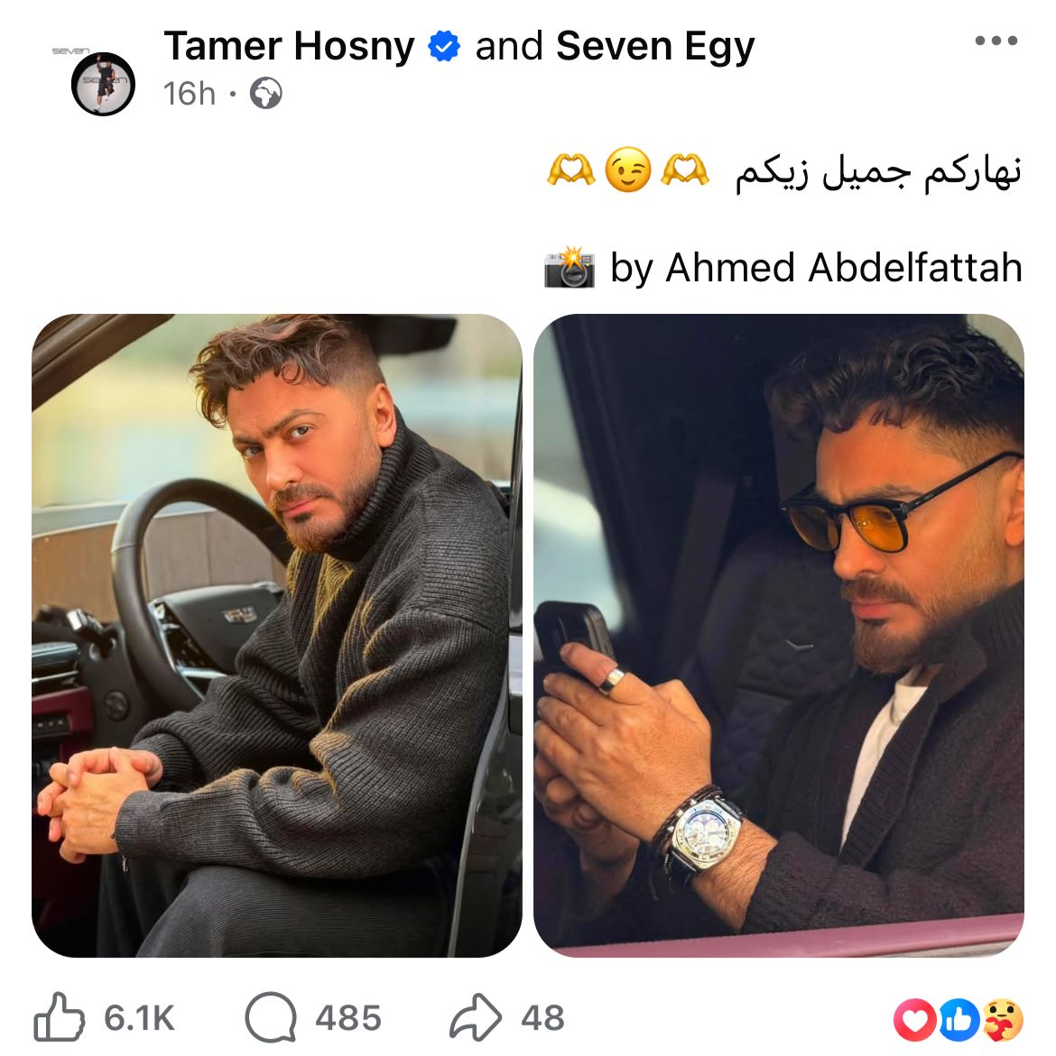 وحرص تامر حسني على التفاعل مع جمهوره، وكتب في منشور له: “نهاركم جميل زيكم”، وخطف الأنظار بإطلالة شتوية كاجوال من داخل سيارته.