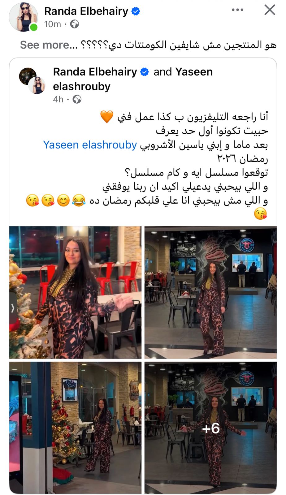وكانت قد أعلنت الفنانة راندا البحيري عن عودتها للتمثيل، وكتبت في منشور سابق عبر حسابها الشخصي على فيسبوك: "أنا راجعه التليفزيون ب كذا عمل فني، حبيت تكونوا أول حد يعرف بعد ماما وابني ياسين الأشروبي، رمضان ٢٠٢٦ توقعوا مسلسل ايه و كام مسلسل؟ واللي بيحبني يدعيلي اكيد ان ربنا يوفقني، واللي مش بيحبني انا علي قلبكم رمضان ده".