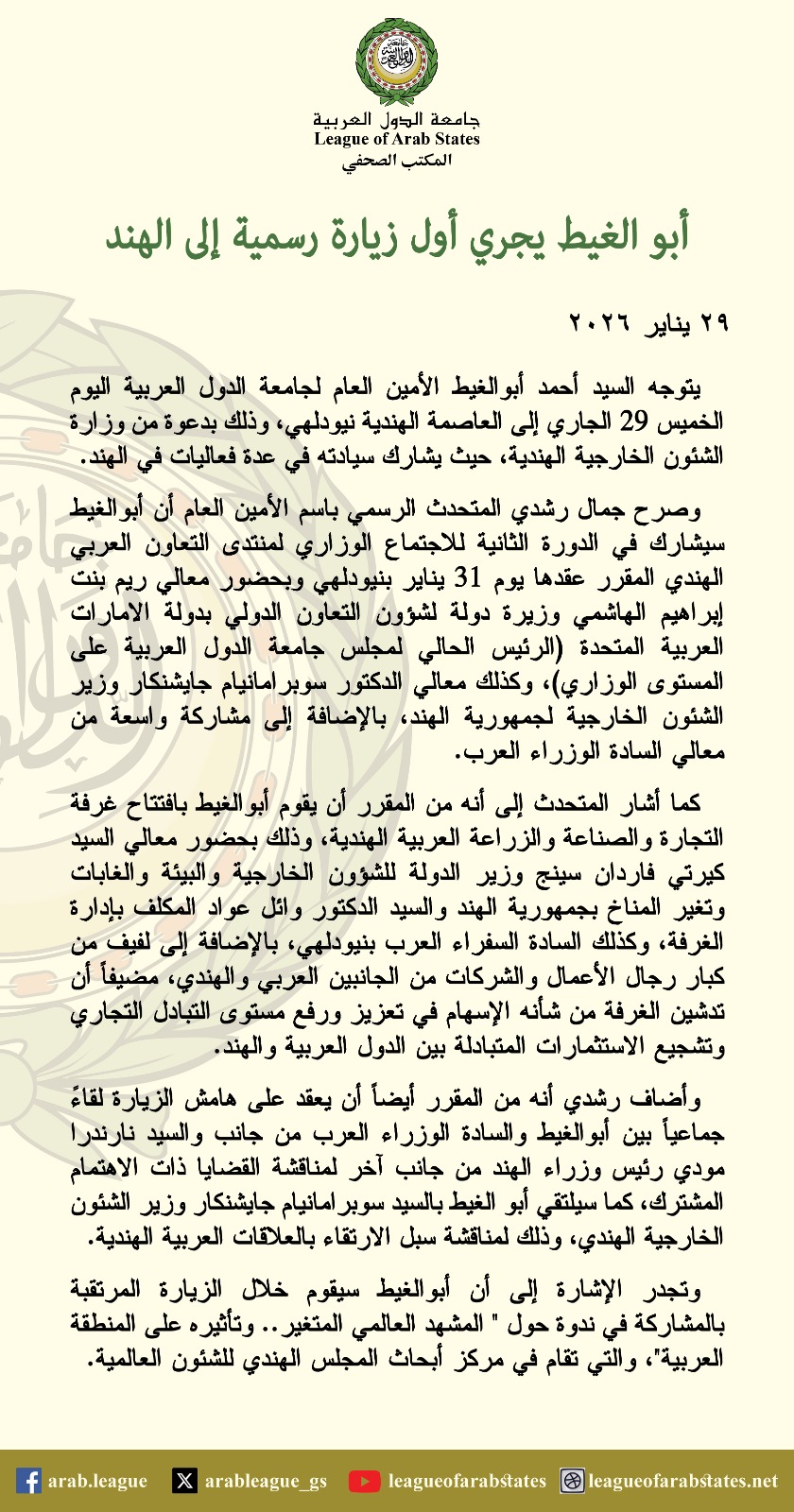 وصرّح السفير جمال رشدي، المتحدث الرسمي باسم الأمين العام، بأن أبو الغيط سيشارك في الدورة الثانية للاجتماع الوزاري لمنتدى التعاون العربي _ الهندي، المقرر عقده في 31 يناير الجاري بنيودلهي، بحضور ريم بنت إبراهيم الهاشمي، وزيرة دولة لشئون التعاون الدولي بدولة الإمارات العربية المتحدة والرئيس الحالي لمجلس جامعة الدول العربية على المستوى الوزاري، إلى جانب الدكتور سوبرامانيام جايشانكار، وزير الشئون الخارجية الهندي، ومشاركة واسعة من أصحاب وزراء الخارجية العرب.