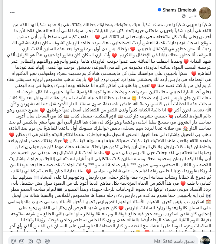 وكتبت شمس البارودي عبر حسابها على موقع التواصل الاجتماعي فيسبوك: “شكرا يا حبيبي شكرا يا حب عمري شكرا لحبك واحتوائك وعطاؤك وحنانك وثقتك في بلا حدود شكرا لهذا الكم من الثقه في أرائي شكرا ياحبيبي منحتنى حرية إتخاذ كثير من القرارات بحب سواء لنفسي أو للعائلة هل فقط لأن ما أحب يريحني وأنت كل ماتفعله معى مايسعدنى ام لثقتك في”.