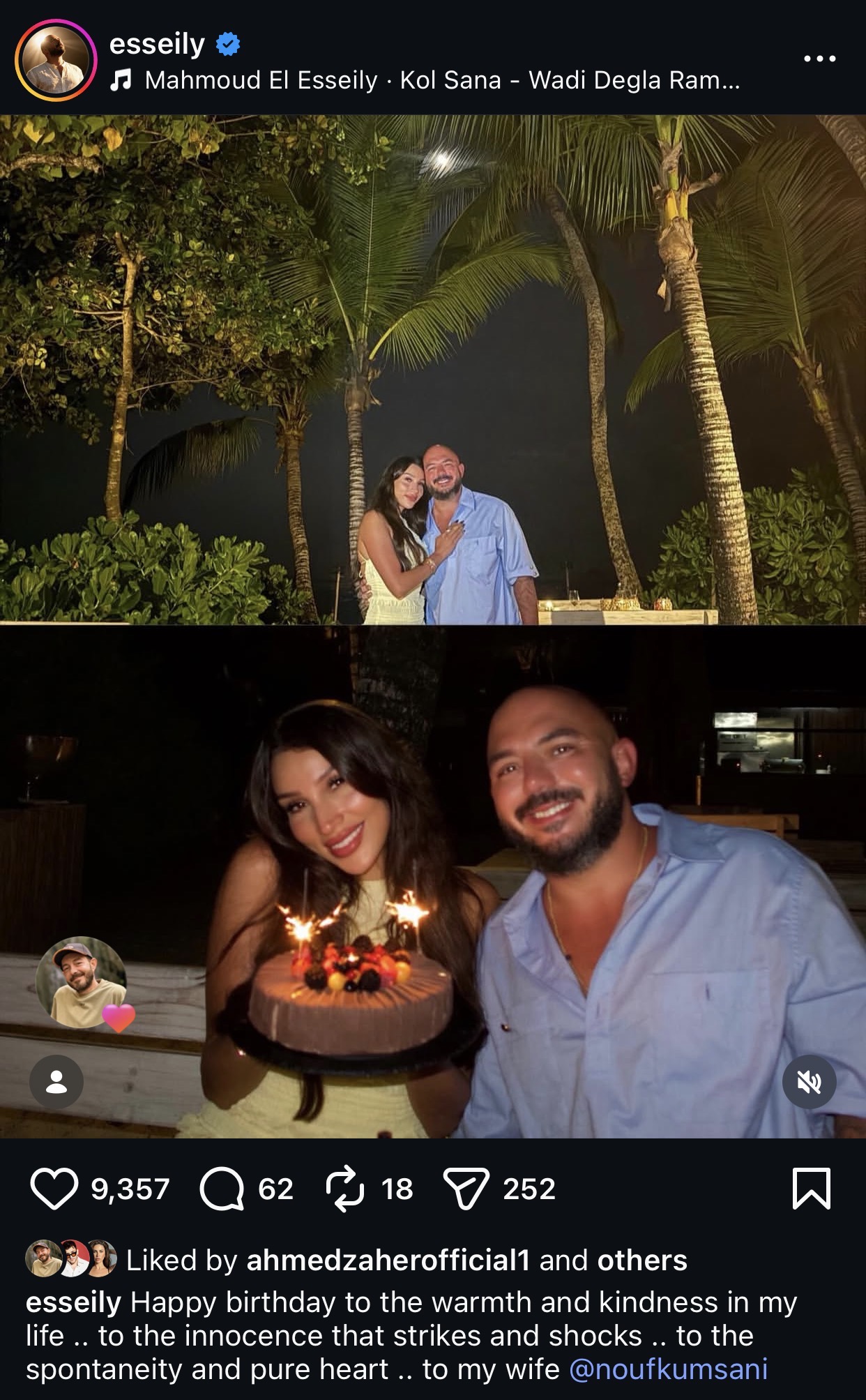 حرص الفنان محمود العسيلي على تهنئة زوجته بمناسبة عيد ميلادها معبرًا عن حبه وامتنانه لها.