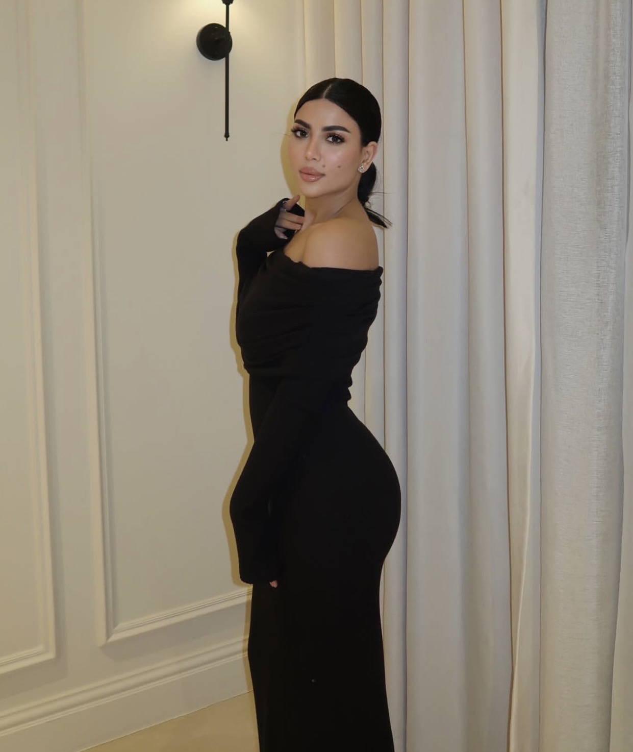 وجاء التصميم بسيطًا وانسيابيًا، مع أكمام طويلة أضافت توازنًا أنيقًا بين الجرأة والرقي.