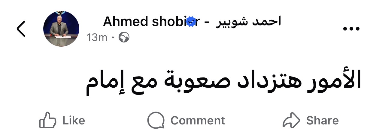 وكتب شوبير على حسابه الشخصي بموقع فيسبوك: "الأمور هتزداد صعوبة مع إمام".