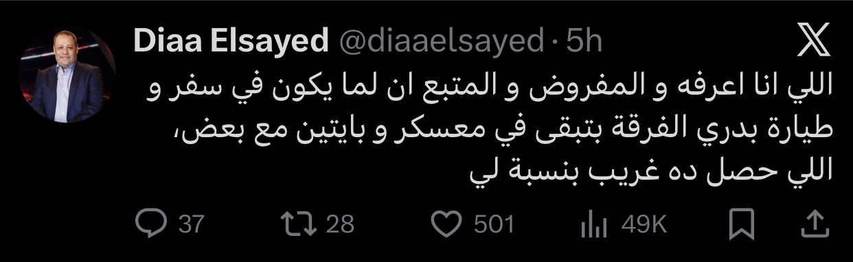 وكتب ضياء السيد عبر حسابه على منصة «X»: «اللي انا اعرفه والمفروض والمتبع ان لما يكون في سفر وطيارة بدري الفرقة بتبقى في معسكر و بايتين مع بعض اللي حصل غريب بالنسبالي”.