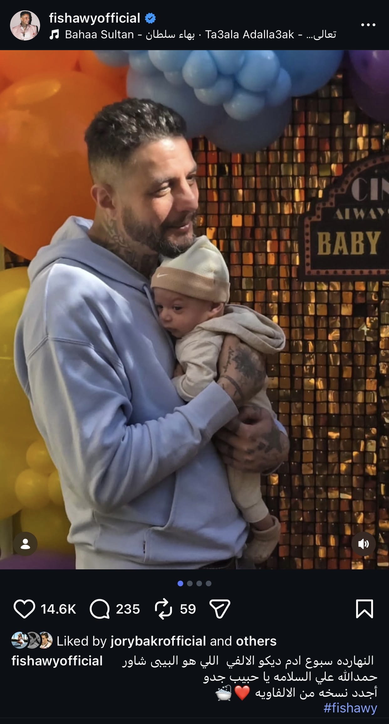 احتفل الفنان أحمد الفيشاوي بسبوع نجل الفنانة سمية الألفي، ابنة خاله، حيث نشر عبر حسابه على موقع إنستجرام مجموعة صور ظهر خلالها وهو يحمل الطفل، وعلّق عليها قائلًا: «النهاردة سبوع آدم ديكو الألفي، اللي هو البيبي شاور.. حمد الله على السلامة يا حبيب جدو»