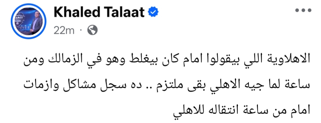 وكتب خالد طلعت عبر حسابه الشخصي بموقع التواصل الاجتماعي فيسبوك : الاهلاوية اللي بيقولوا امام كان بيغلط وهو في الزمالك ومن ساعة لما جه الاهلي بقى ملتزم .. ده سجل مشاكل وازمات امام من ساعة انتقاله للاهلي.