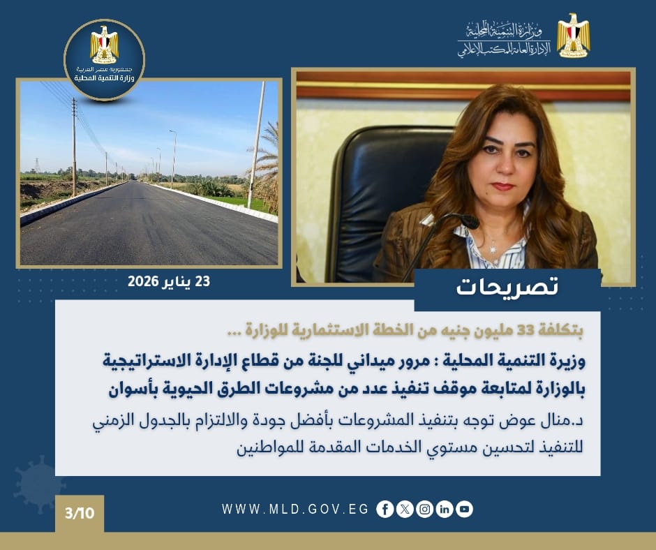 وتلقت الدكتورة منال عوض وزير التنمية المحليه، تقريراً من قطاع الإدارة الاستراتيجية والتنمية المحلية بالوزارة حول نتائج المرور الميداني للجنة من القطاع علي عدد من مشروعات الطرق الحيوية بمحافظة أسوان التى يتم تمويلها من الخطة الاستثمارية لوزارة التنمية المحلية في جهود تطوير ورفع كفاءة البنية التحتية وتحسين مستوى الخدمات المقدمة للمواطنين في جميع المحافظات .