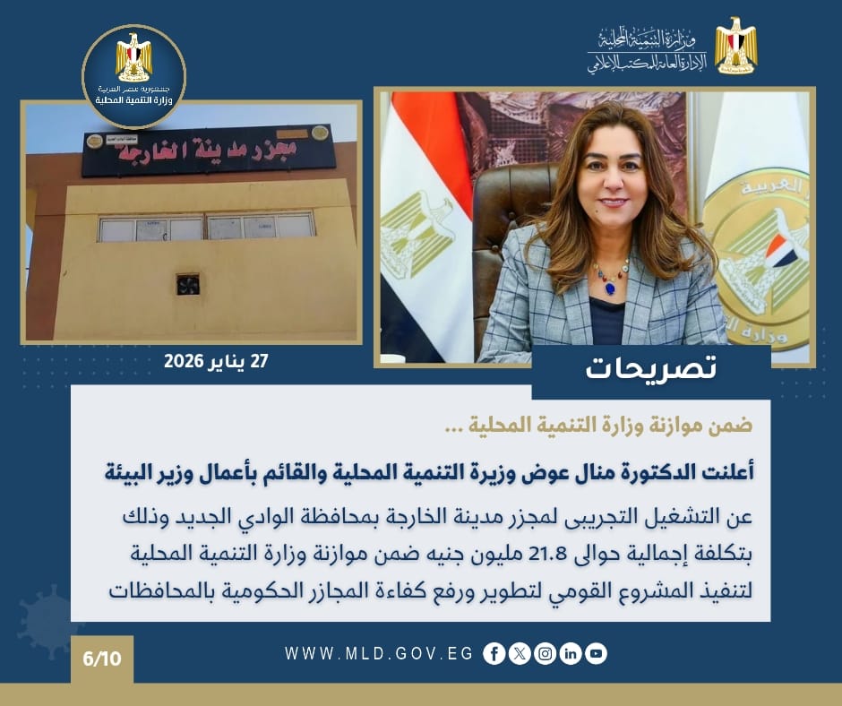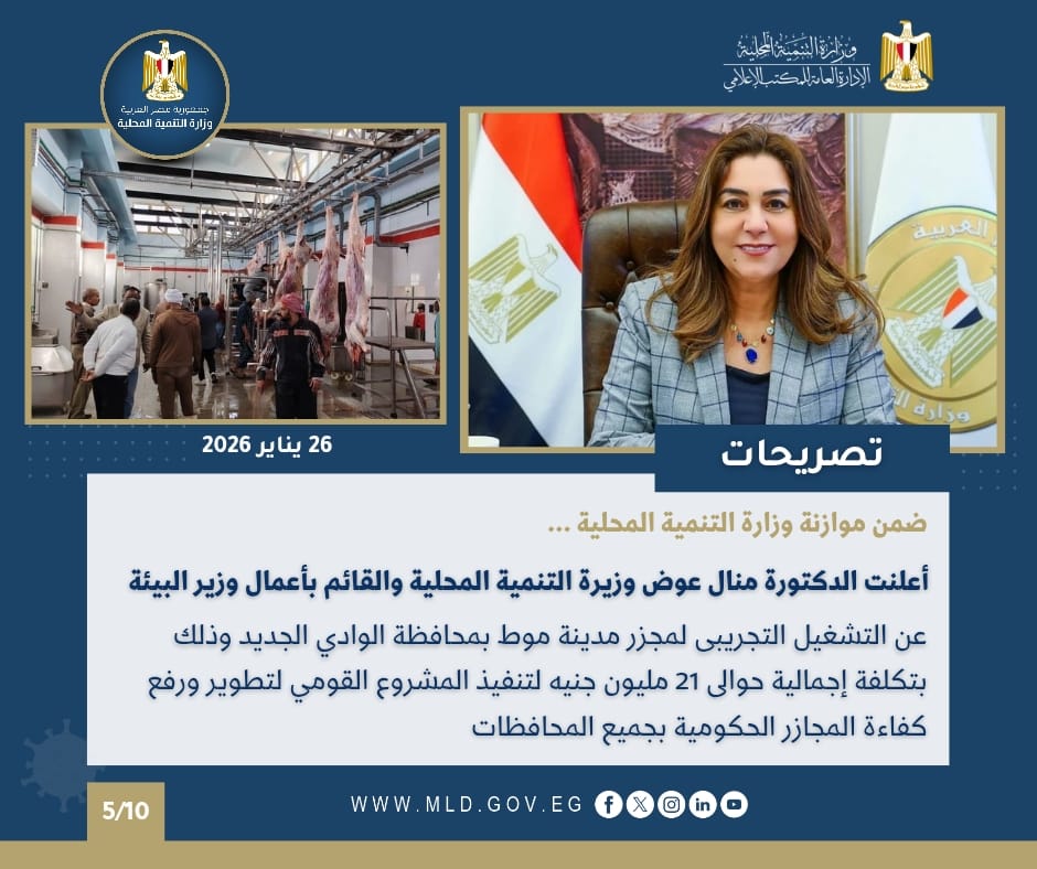 كما أعلنت الدكتورة منال عوض وزيرة التنمية المحلية والقائم بأعمال وزير البيئة، عن التشغيل التجريبى لمجزر مدينة موط بمحافظة الوادي الجديد وذلك بتكلفة إجمالية حوالى 21 مليون جنيه ضمن موازنة الوزارة لتنفيذ المشروع القومي لتطوير ورفع كفاءة المجازر الحكومية بجميع المحافظات .