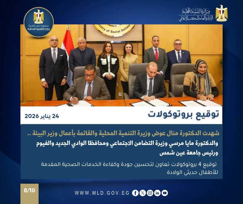 شهدت الدكتورة منال عوض وزيرة التنمية المحلية والقائمة بأعمال وزيرة البيئة، والدكتورة مايا مرسي وزيرة التضامن الاجتماعي، واللواء محمد الزملوط محافظ الوادي الجديد، والدكتور أحمد الأنصاري محافظ الفيوم، والدكتور محمد ضياء الدين رئيس جامعة عين شمس، والدكتور جمال سامي رئيس الجمعية المصرية لرعاية الأطفال حديثي الولادة والمبتسرين توقيع 4 بروتوكولات تعاون لتعزيز التعاون والتنسيق لتحسين جودة وكفاءة الخدمات الصحية المقدمة للأطفال حديثي الولادة.