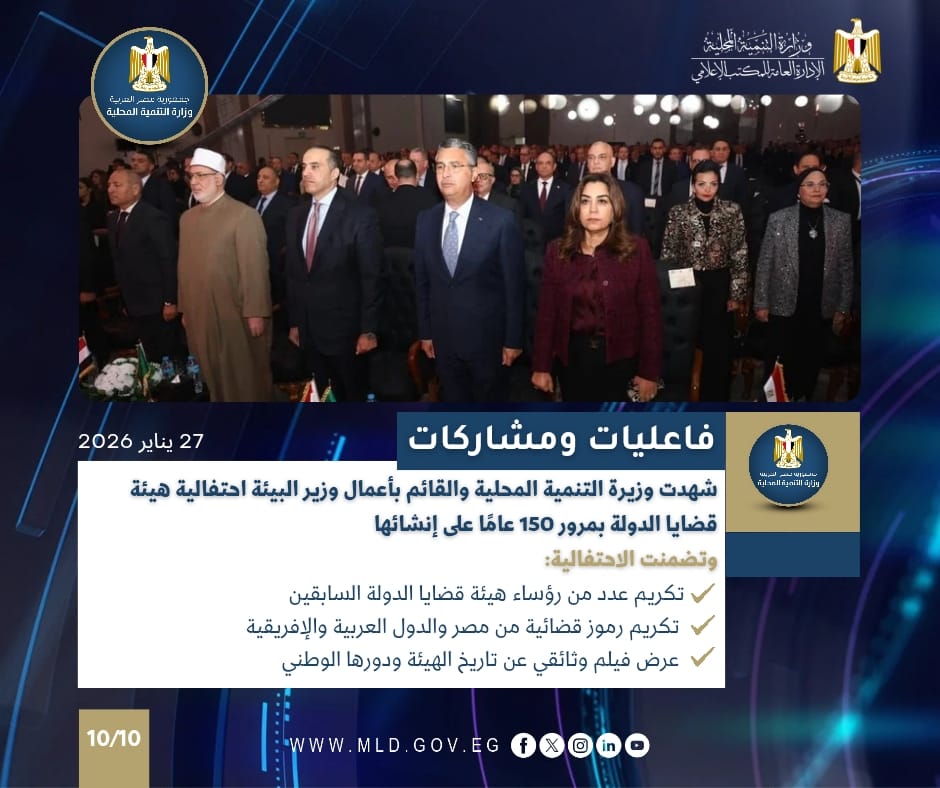 كما شهدت الدكتورة منال عوض وزيرة التنمية المحلية والقائم بأعمال وزير البيئة، احتفالية هيئة قضايا الدولة بمناسبة مرور 150 عاماً على إنشائها والتى تقام تحت رعاية فخامة الرئيس عبدالفتاح السيسى، وذلك بحضور المستشار الدكتور حسين مدكور رئيس الهيئة، والمستشار عصام فريد، رئيس مجلس الشيوخ وعدد من كبار رجال الدولة والوزراء والمحافظين ورؤساء الهيئات والجهات القضائية، والشخصيات العامة والسفراء والدبلوماسيين.